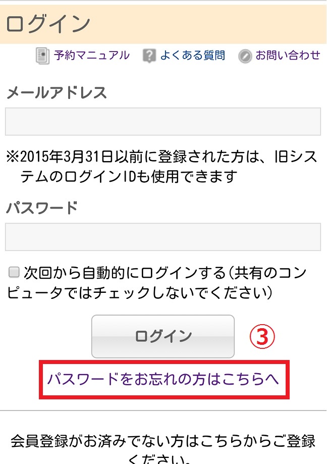 ③パスワードを忘れてしまった場合は、【パスワードをお忘れの方はこちらへ】を押して、次の画面でメールアドレスを入力し、パスワードを再設定してください。