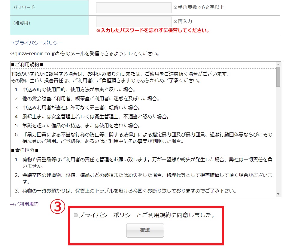 ③入力が終わりましたら利用規約をご一読の後、【確認】ボタンを押してください。