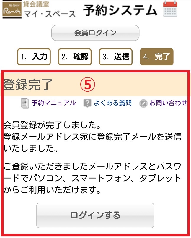 ⑤この画面が表示されましたら新規会員登録が終了です。【ログインする】ボタンを押してマイページへ移動してください。