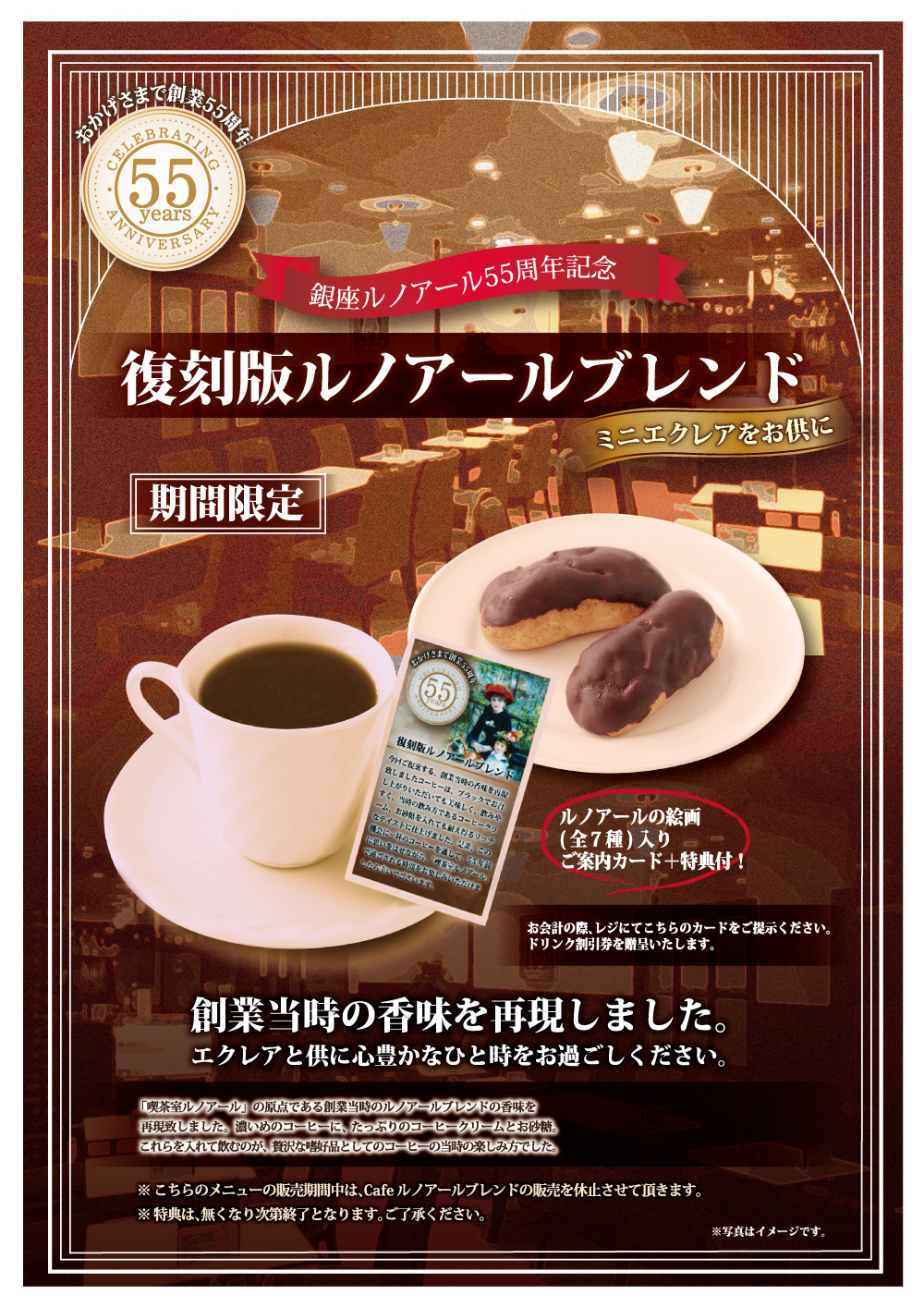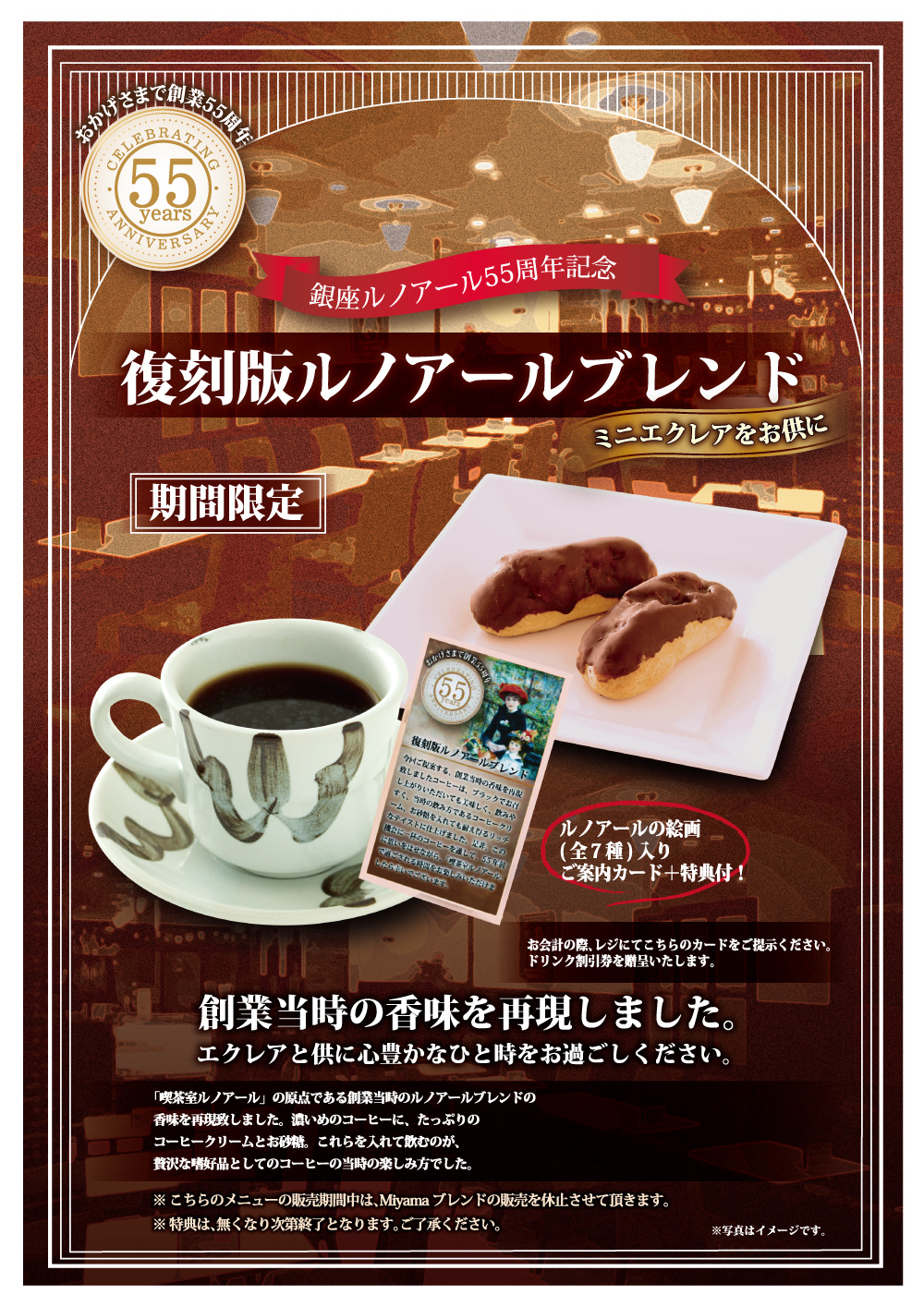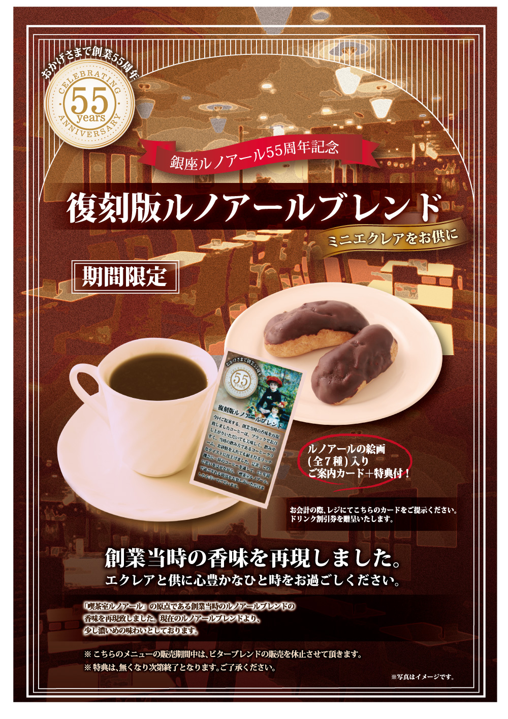 この度、株式会社銀座ルノアールが創業55周年を迎えるにあたり、「喫茶室ルノアール」の原点である創業当時のルノアールブレンドの香味を再現致しました。