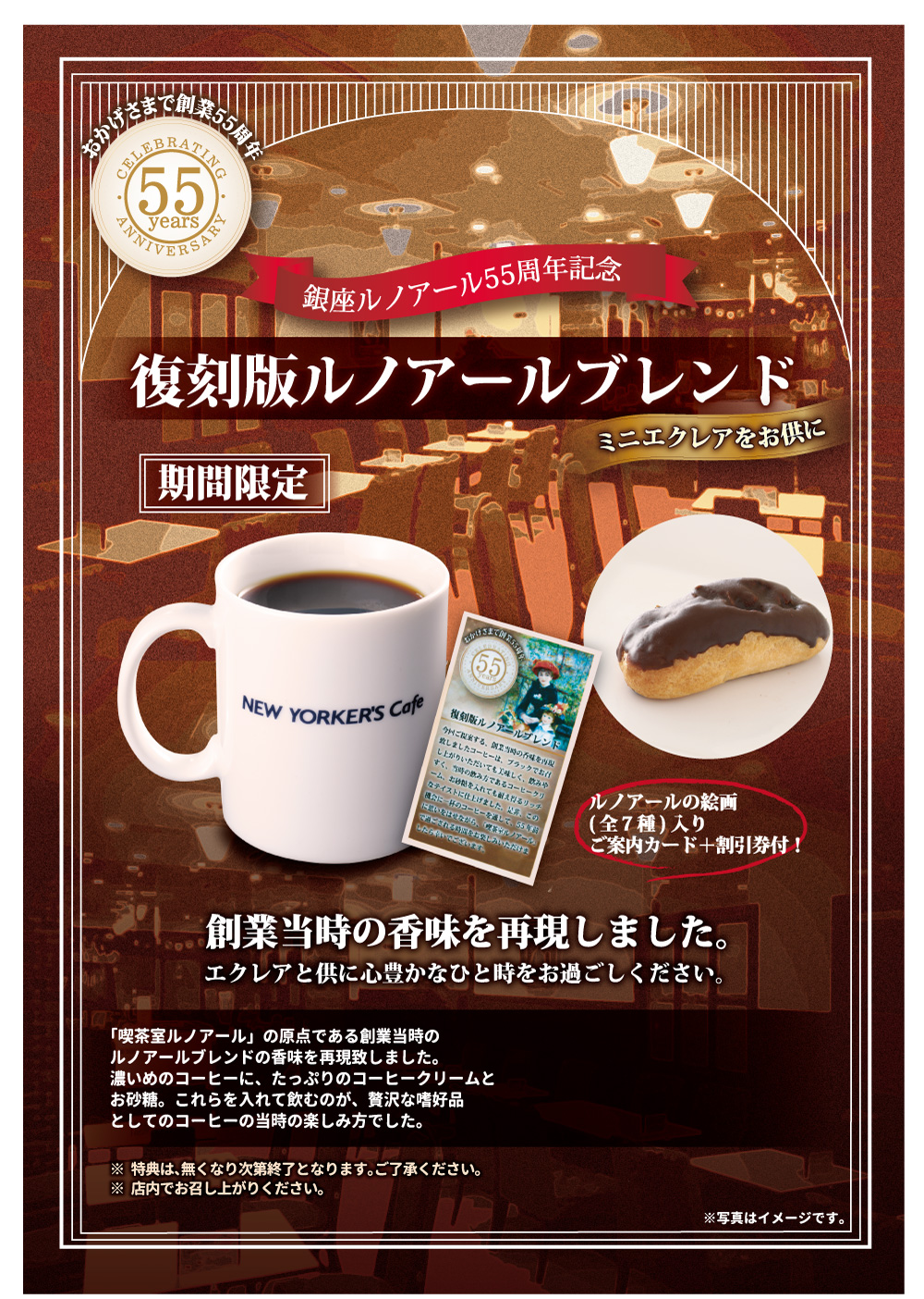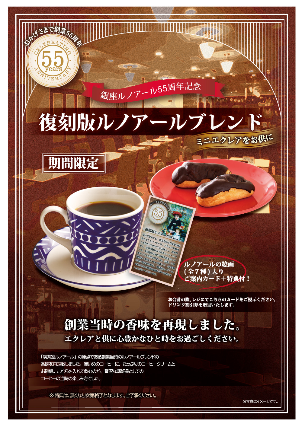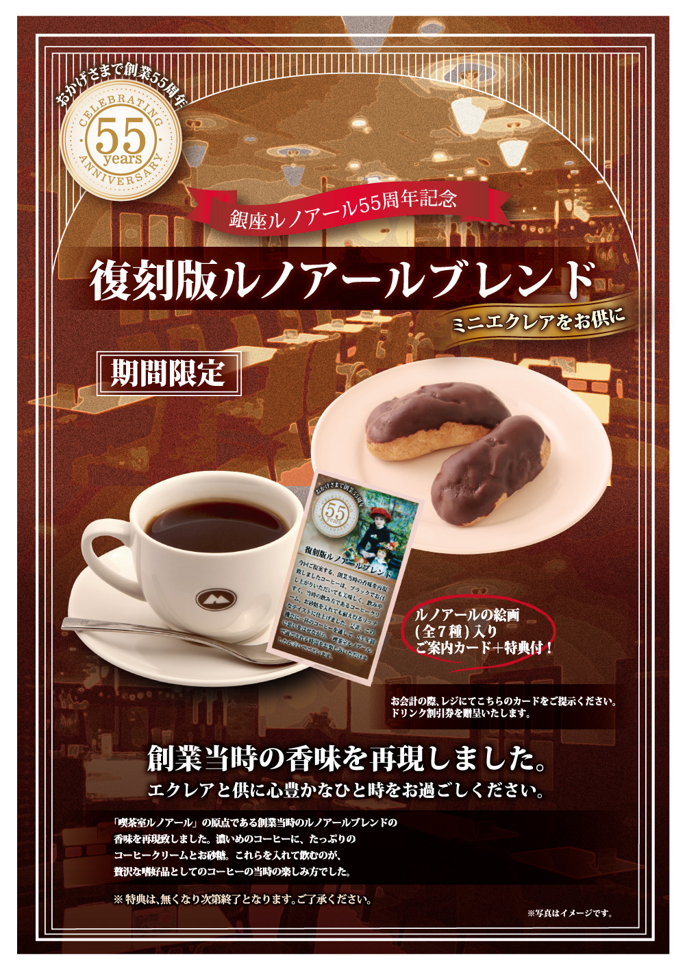 この度、株式会社銀座ルノアールが創業55周年を迎えるにあたり、「喫茶室ルノアール」の原点である創業当時のルノアールブレンドの香味を再現致しました。