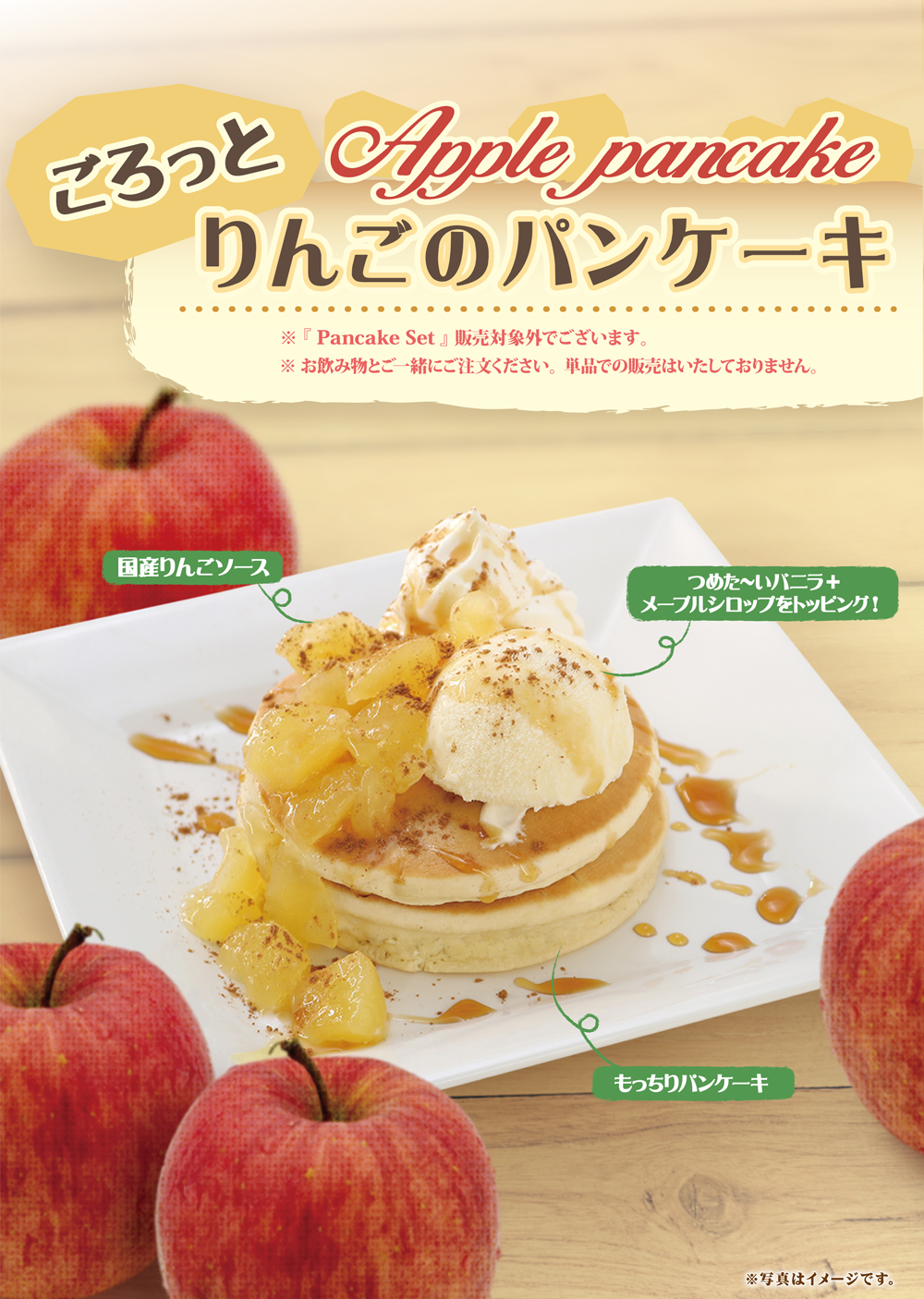 新宿京王モール店 8月15日開始 期間限定パンケーキメニュー 2019年8月15日 8月15日(木)より下記の期間限定『ごろっとりんごのパンケーキ』が導入となります。是非ご賞味ください。 ごろっとりんごのパンケーキ 果実とピューレに国産りんごをたっぷり使用したりんごソース。温かいパンケーキにつめた~いバニラアイスクリームを乗せて、メープルシロップをトッピングして仕上げました。 実施対象店舗 新宿京王モール店