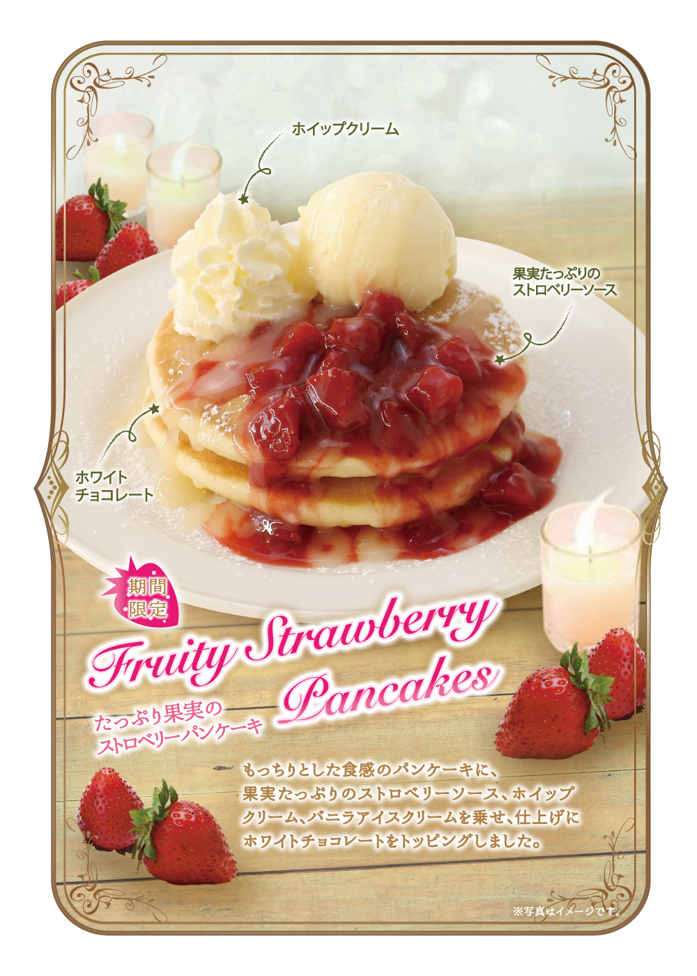 12月15日開始 4店舗限定パンケーキメニュー 2019年12月16日 期間限定パンケーキメニュー 2019年12月15日(日) 開始 たっぷり果実のストロベリーパンケーキ やわらかく、もっちりとした食感のパンケーキ。果実たっぷりのストロベリーソースとホワイトチョコレートソース、バニラアイスの組み合わせをお楽しみください。 実施対象店舗 御徒町春日通り店、新宿京王モール店、上野公園前店、秋葉原昭和通り口店