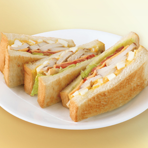 8月12日開始 期間限定"プレミアムサンドウィッチメニュー" 2020年8月12日 "贅沢サンドウィッチ" ありたどり厚切りローストチキンのクラブハウスサンドウィッチ コクのあるチェダーチーズがグザイのうまみをひきたたせ、自家製たまごペーストの味わいがやさしく包み込みます。何度食べても飽きのこない、王道の味わいを是非ご賞味ください。