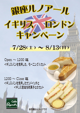 7月28日(土)開始 イギリスロンドンキャンペーン 2012年7月25日 Cafeルノアール各店舗おきまして、平成24年7月28日(土)から8月13日(月)までの間、下記の特別メニューを販売いたします。是非ご賞味ください。 店舗のご案内はこちら