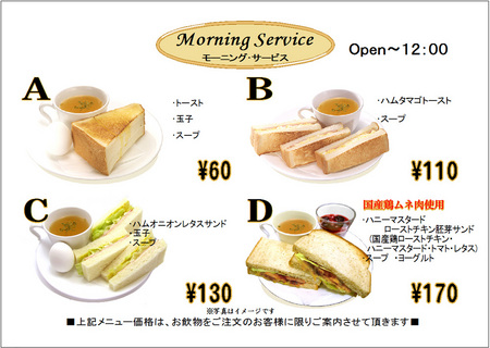 10月12日(金)開始 モーニングメニュー 2012年10月12日 Cafeルノアール各店舗におきまして、平成24年10月12日金曜日よりモーニングメニューが変更となります。是非ご賞味ください。 ※日本橋三越前店は一部メニュー内容が異なります。何卒ご了承下さい。 メニューのご案内はこちら 各店舗のご案内はこちらから