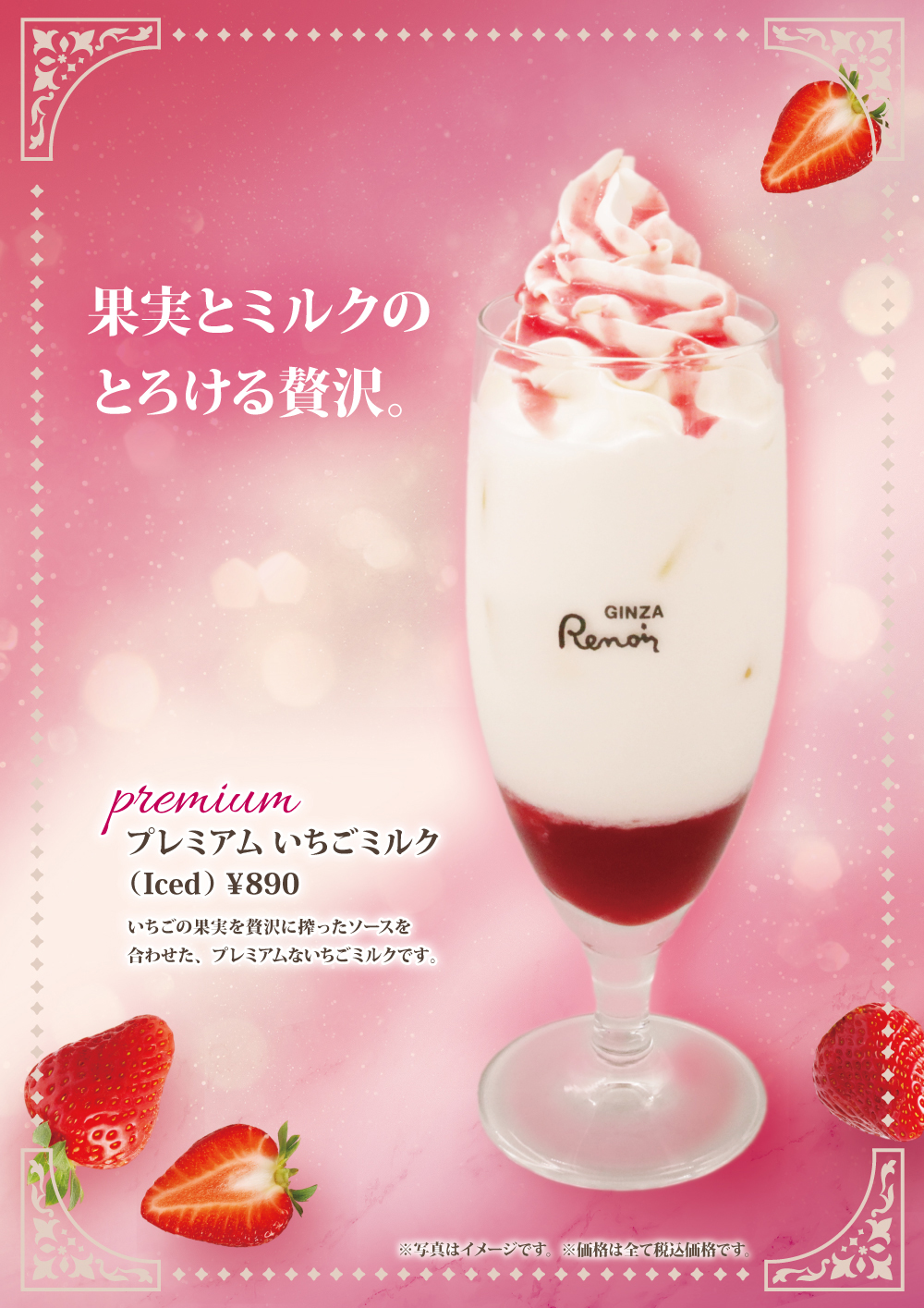 期間限定ドリンク 2026年3月16日(月) 開始 プレミアムいちごミルク Iced ¥770 いちごの果実を贅沢に搾ったソースを合わせた、プレミアムないちごミルクです。 Cafeルノアール インフォメーション 季節のおすすめ メニュー 当店のこだわり カロリー・アレルギー物質情報 店舗検索 採用情報 喫茶室ルノアール Cafeルノアール Cafe Renoir《New Style !!》 ミヤマ珈琲 CafeMiyama NEW YORKER’SCafe 貸会議室マイ・スペース 個人空間マイ・ブース BAKERYHINATA Alinecafé et sucreries