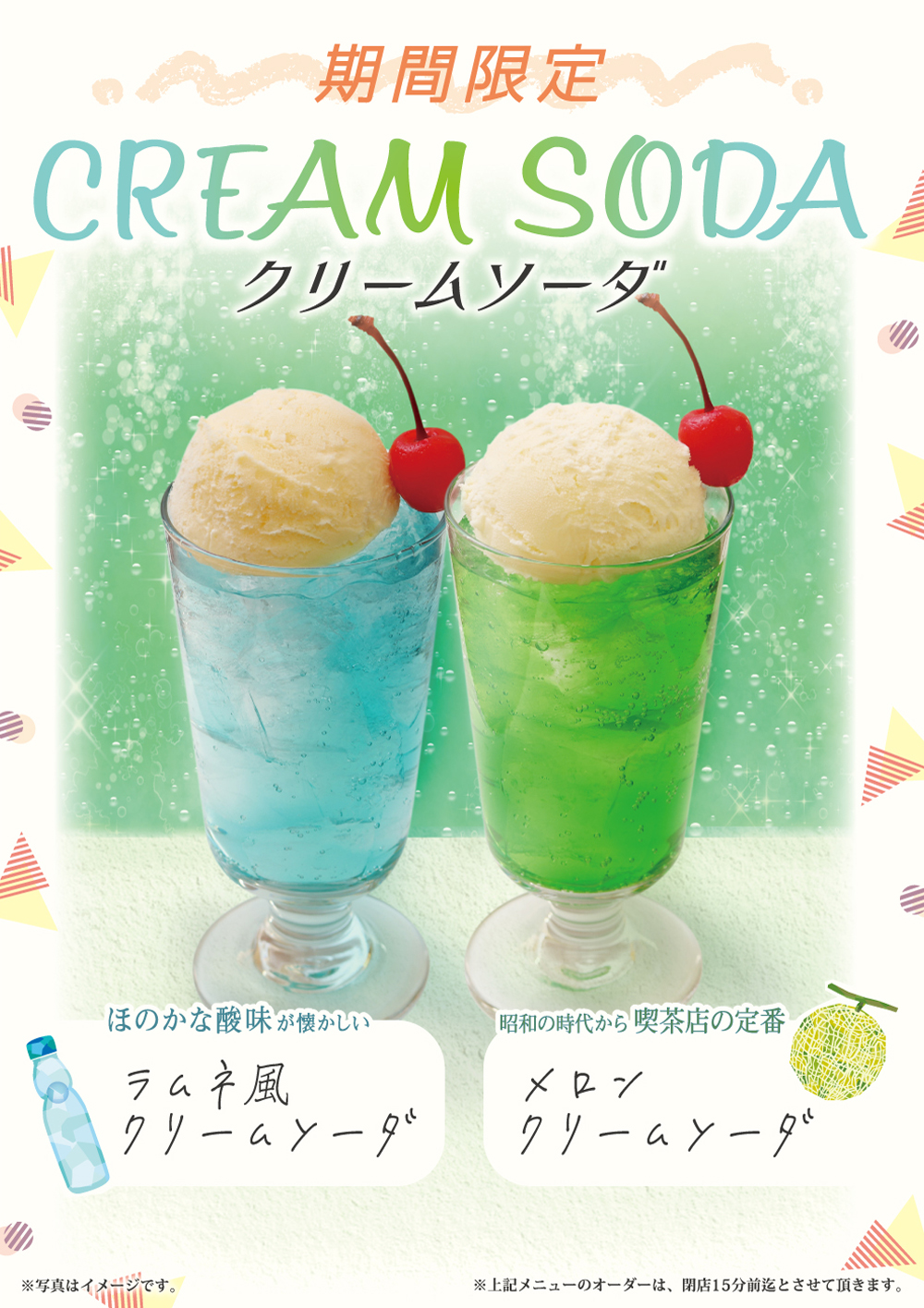 4月15日開始 期間限定おすすめメニュー 2020年4月15日 期間限定 おすすめメニュー 2020年4月15日(水)開始 メロンクリームソーダ 昭和の時代から喫茶店の定番!長年愛され時代は変わっても味は変わらない。メロン味のソーダにバニラアイスとサクランボを乗せて見た目も可愛いドリンクです。 ラムネ風クリームソーダ 酸味がほのかに残る見た目も涼しげなドリンク。バニラアイスとサクランボを乗せて、爽やかなクリームソーダに仕上げました。
