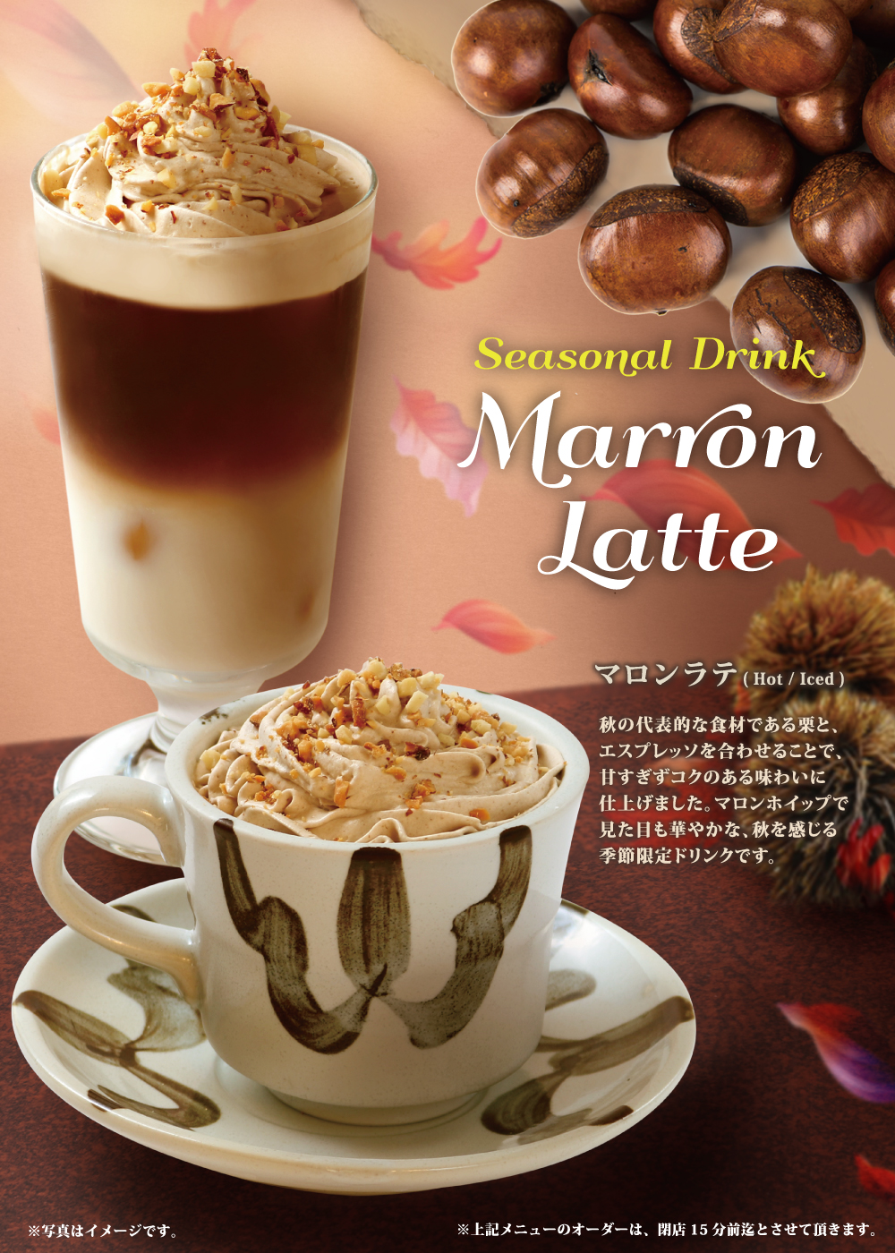 8月15日開始 期間限定おすすめメニュー 2020年8月14日 マロンラテ (Hot/Iced) 秋の代表的な食材である栗と、エスプレッソを合わせることで、甘すぎずコクのある味わいに仕上げました。マロンのホイップで見た目も華やかな、秋を感じる季節限定ドリンクです。