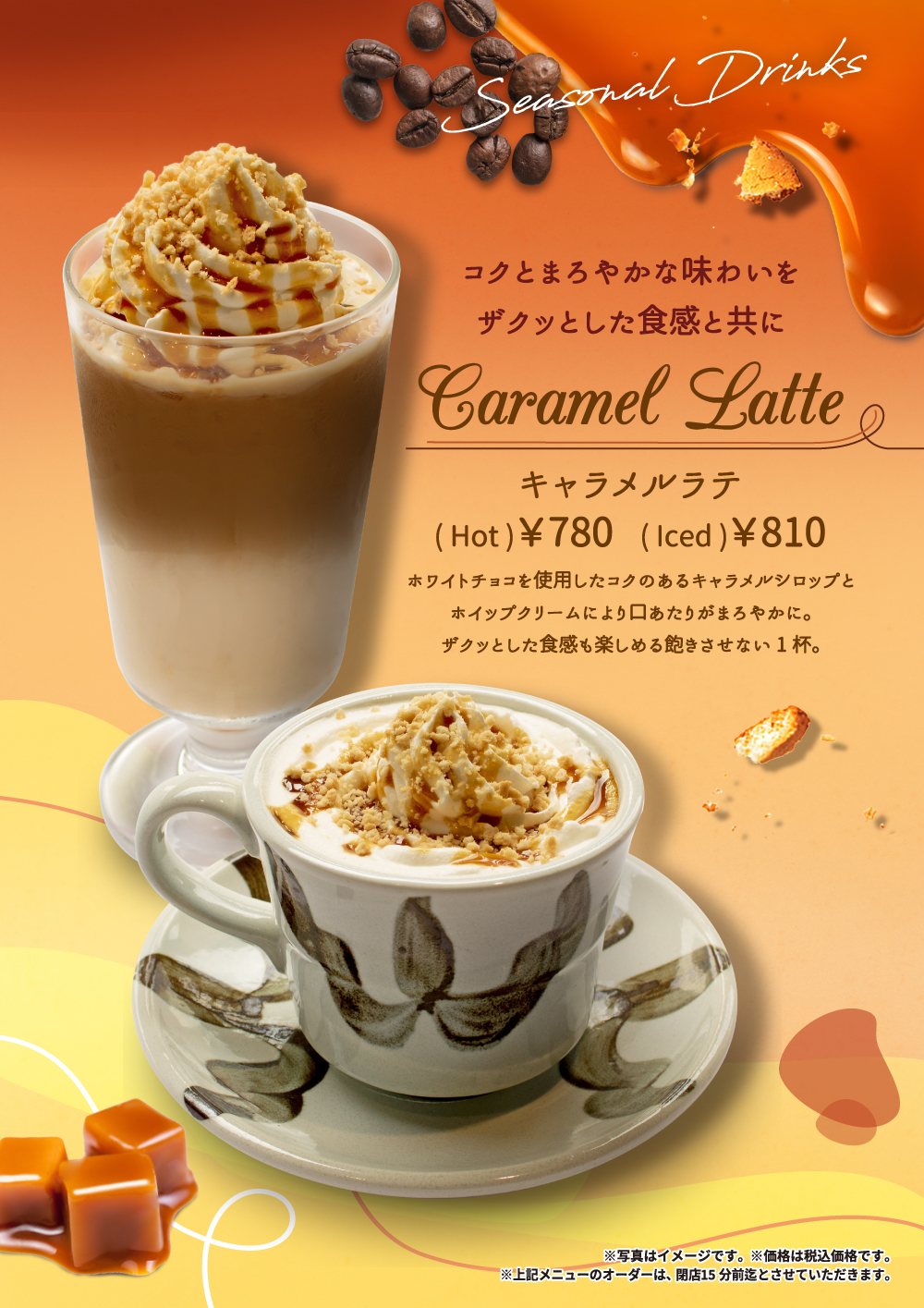 10月13日(木)開始 期間限定ドリンク『キャラメルラテ』 2022年10月13日 期間限定ドリンク キャラメルラテ (Hot/Iced) ホワイトチョコを使用したコクのあるキャラメルシロップとホイップクリームにより口あたりがまろやかに。ザクっとした食感も楽しめる飽きさせない1杯。