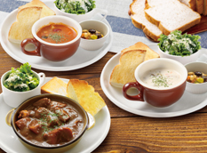 【フードメニュー】 ルノアールの定番「モーニング・サービス」、「ピザトースト」などのほか、「パスタメニュー」、「スーププレート」、「ビーフシチュー」など、ランチタイム以降もご満足いただけるメニューをご用意しております。