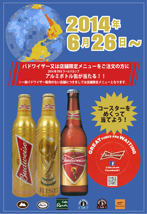 ワールドカップ応援キャンペーンのご案内 2014年6月23日 株式会社銀座ルノアール直営店の各店舗におきまして、平成26年6月26日(木)よりワールドカップ応援キャンペーンが実施となります。 対象外店舗:喫茶室ルノアール恵比寿西口第1店、恵比寿東口店、淡路町店、大塚店、新小岩店、吉祥寺店、箱根湯本駅前店、川越店、金町店
