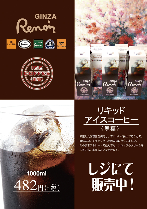「リキッドアイスコーヒー」販売のご案内 2014年6月27日 株式会社銀座ルノアール直営店の各店舗におきまして、平成26年6月27日(金)より「リキッドアイスコーヒー」を発売致します。 対象外店舗:喫茶室ルノアール恵比寿西口第1店、恵比寿東口店、淡路町店、大塚店、新小岩店、吉祥寺店、箱根湯本駅前店、川越店、金町店