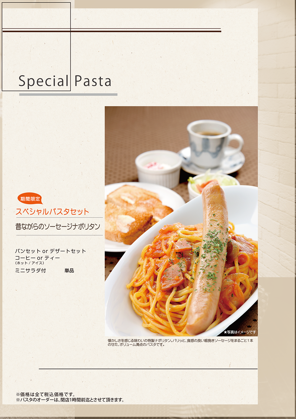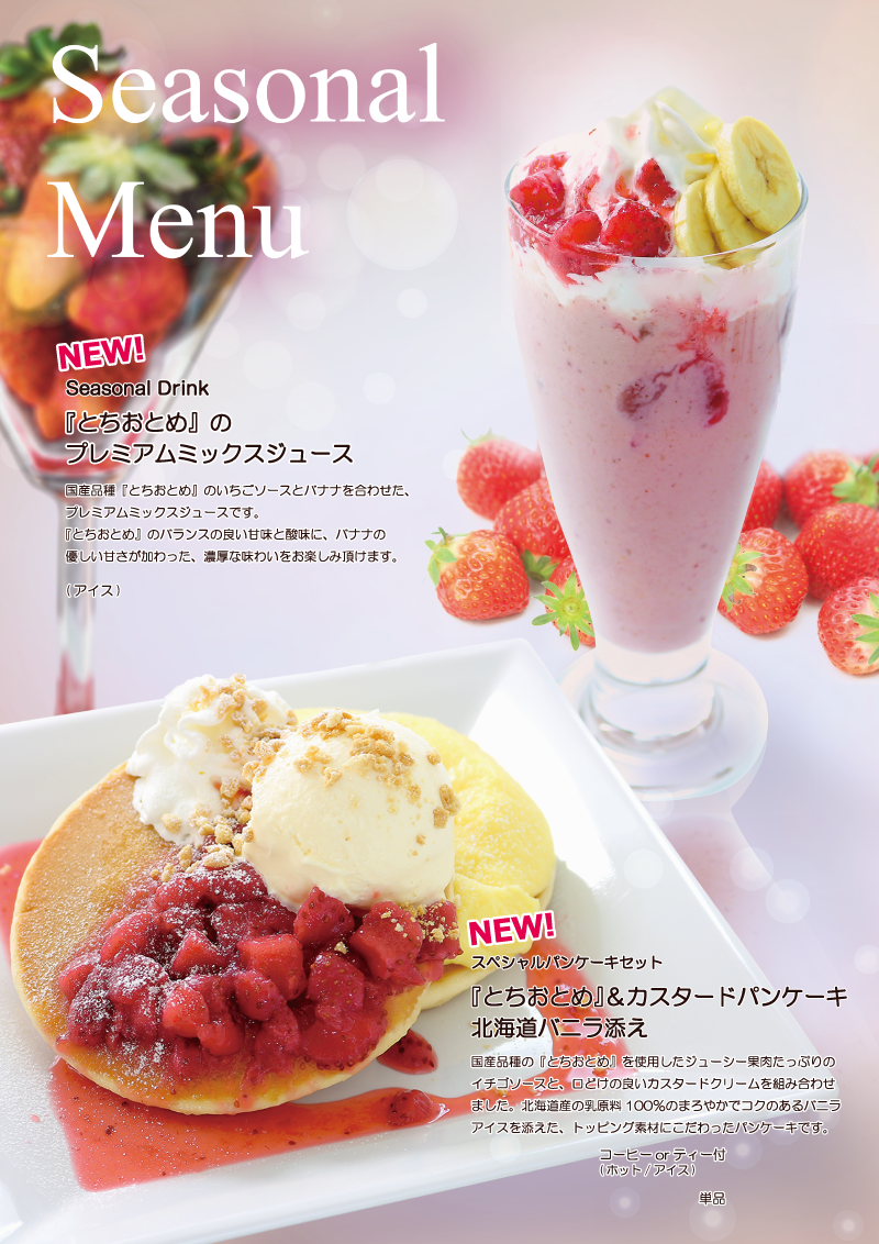 3月1日開始 期間限定おすすめメニュー 2017年2月28日 季節限定春のおすすめメニュー 2017年3月1日(水)開始 『とちおとめ』のプレミアムミックスジュース 国産品種『とちおとめ』のいちごソースとバナナを併せた、プレミアムミックスジュースです。『とちおとめ』のバランスの良い甘みと酸味に、バナナの優しい甘さが加わった、濃厚な味わいをお楽しみ頂けます。 『とちおとめ』&カスタードパンケーキ 国産品種『とちおとめ』を使用したジューシーな果肉たっぷりのイチゴソースと、口どけの良いカスタードクリームを組み合わせました。北海道産の乳原料100%のまろやかでコクのあるバニラアイスを添えた、トッピング素材にこだわったパンケーキです。 昔ながらのソーセージナポリタン 懐かしさを感じる味わいの特製ナポリタン。 パリッと、食感の良い粗挽きソーセージをまるごと1本のせた、ボリューム満点のパスタです。