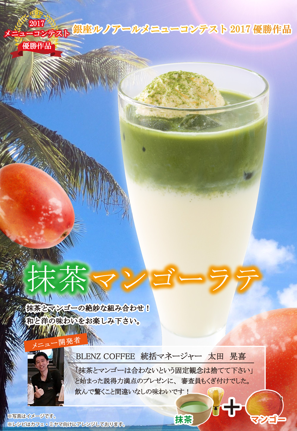 「この一見合わなそうな"抹茶"と"マンゴー"の組み合わせ、不思議なのにおいしいドリンクを是非お試しください。やみつきになります。」