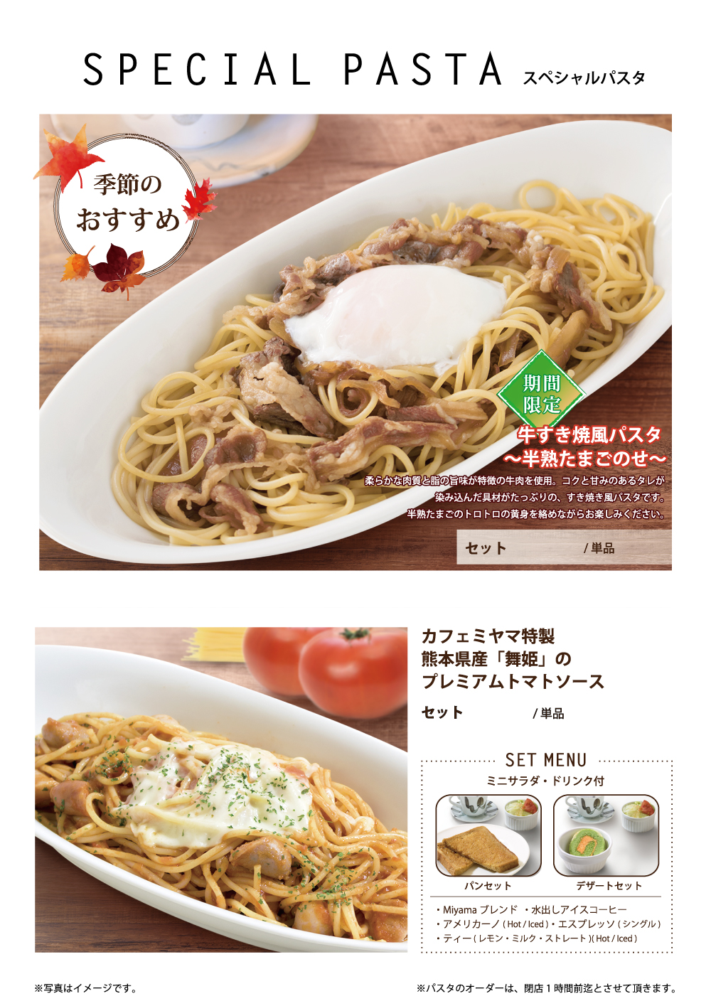 9月1日開始 期間限定おすすめメニュー 2017年9月01日 季節限定秋のおすすめメニュー 2017年9月1日(金)開始 牛すき焼風パスタ ~半熟たまごのせ~ 柔らかな肉質と脂のうまみが特徴の牛肉を使用。 コクと甘みのあるタレがしみ込んだ具材がたっぷりの、すき焼き風パスタです。 半熟たまごのトロトロの黄身を絡めながらお楽しみください。 おいものクリーミーラテ 鳴門金時を使用したクリームにさつまいもシロップを加えました。 エスプレッソがほんのり香る、まるでスイートポテトのような秋らしいドリンクです。 紫芋と鳴門金時のおいもたっぷりパンケーキ 紫芋アイスと鳴門金時クリームを使用し、2種類の国産のさつまいもの味を楽しめる秋にぴったりなパンケーキです。