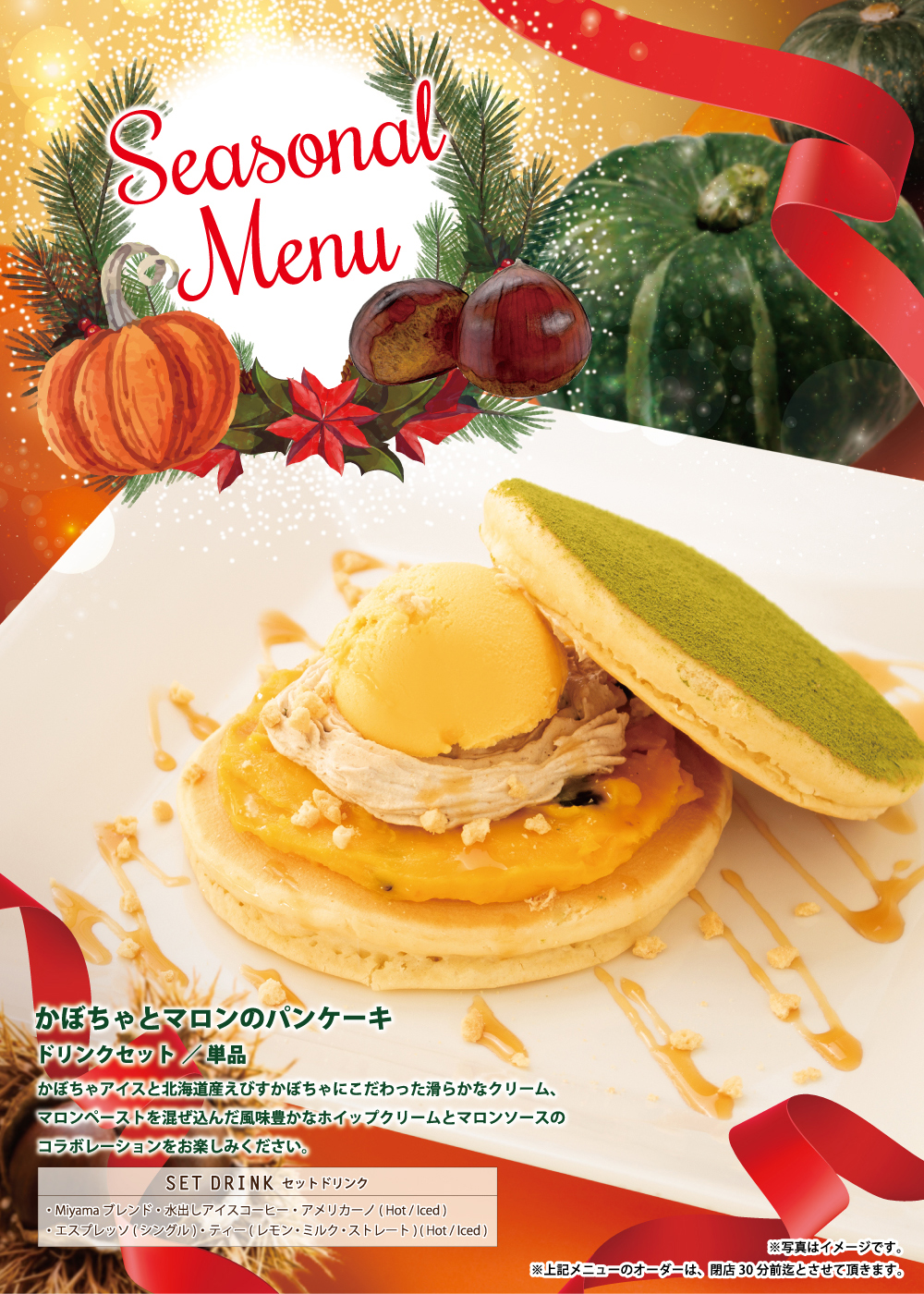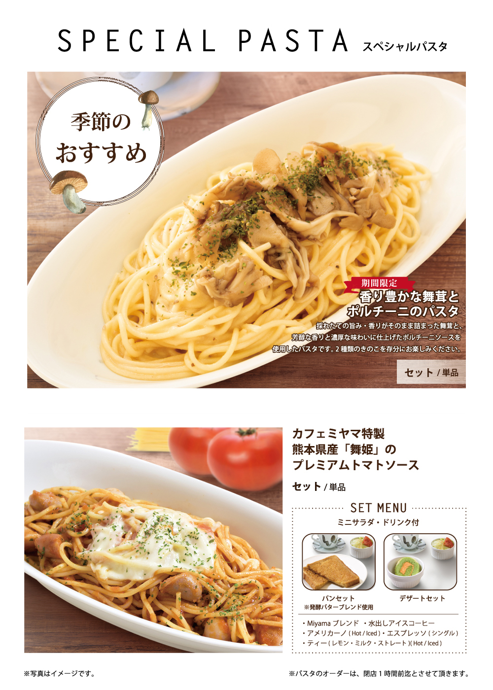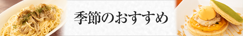 12月1日開始 期間限定おすすめメニュー 2018年12月1日 期間限定冬のおすすめメニュー 2018年12月1日(土)開始 香り豊かな舞茸とポルチーニのパスタ 採れたての旨み・香りがそのまま詰まった舞茸と、 芳醇な香りと濃厚な味わいに仕上げたポルチーニソースを 使用したパスタです。2種類のきのこを存分にお楽しみください。 かぼちゃとマロンのパンケーキ かぼちゃアイスと北海道産えびすかぼちゃにこだわった滑らかなクリーム、マロンペーストを混ぜ込んだ風味豊かなホイップクリームとマロンソースのコラボレーションをお楽しみください。