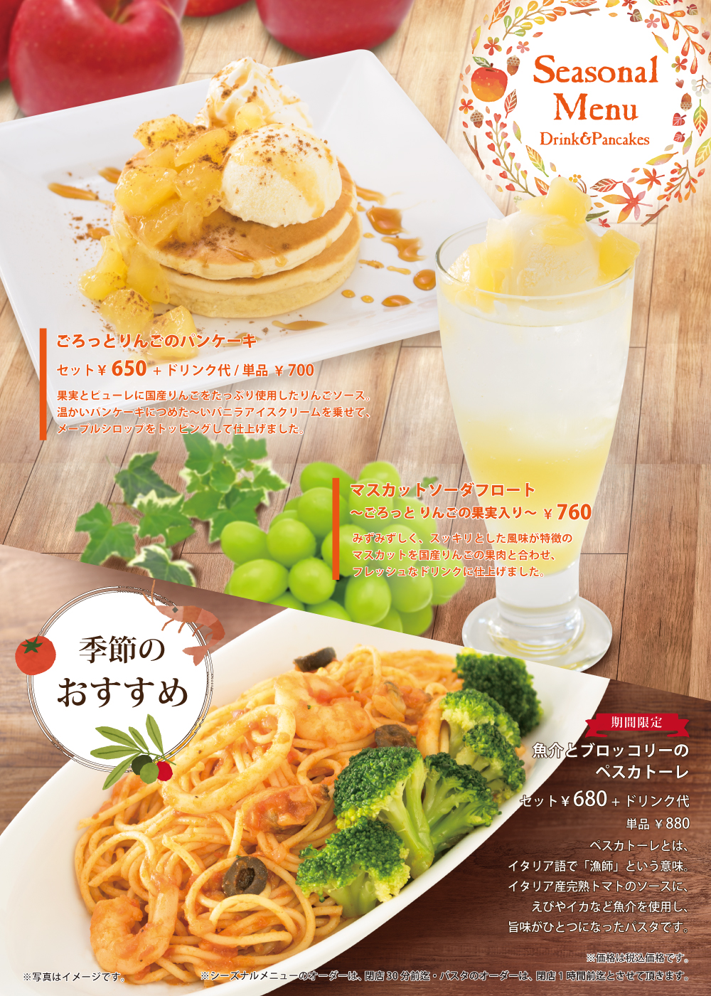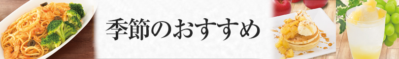 8月15日開始 期間限定おすすめメニュー 2019年8月15日 期間限定 おすすめメニュー 2019年8月15日(木)開始 マスカットソーダフロート ~ごろっと りんごの果実入り~ みずみずしく、スッキリとした風味が特徴のマスカットを国産りんごの果肉と合わせ、フレッシュなドリンクに仕上げました。 魚介とブロッコリーのペスカトーレ ペスカトーレとは、イタリア語で「漁師」という意味。イタリア産完熟トマトのソースに、えびやイカなど魚介を使用し、旨味がひとつになったパスタです。 ごろっとりんごのパンケーキ 果実とピューレに国産りんごをたっぷり使用したりんごソース。温かいパンケーキにつめた~いバニラアイスクリームを乗せて、メープルシロップをトッピングして仕上げました。