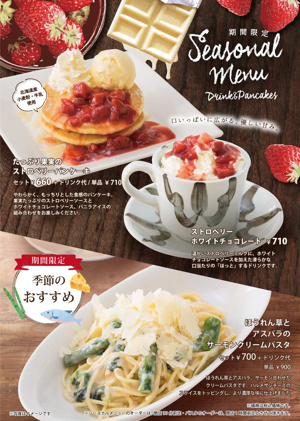 12月15日開始 期間限定おすすめメニュー 2019年12月16日 期間限定 おすすめメニュー 2019年12月15日(日)開始 ストロベリーホワイトチョコレート 温かいストロベリーミルクに、ホワイトチョコレートソースを加えた滑らかな口当たりの「ほっと」するドリンクです。 ほうれん草とアスパラのサーモンクリームパスタ ほうれん草とアスパラ、サーモン合わせたクリームパスタです。パルメザンチーズのスライスをトッピングし、より濃厚な味に仕上げました たっぷり果実のストロベリーパンケーキ やわらかく、もっちりとした食感のパンケーキ。果実たっぷりのストロベリーソースとホワイトチョコレートソース、バニラアイスの組み合わせをお楽しみください。