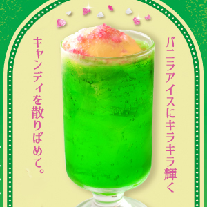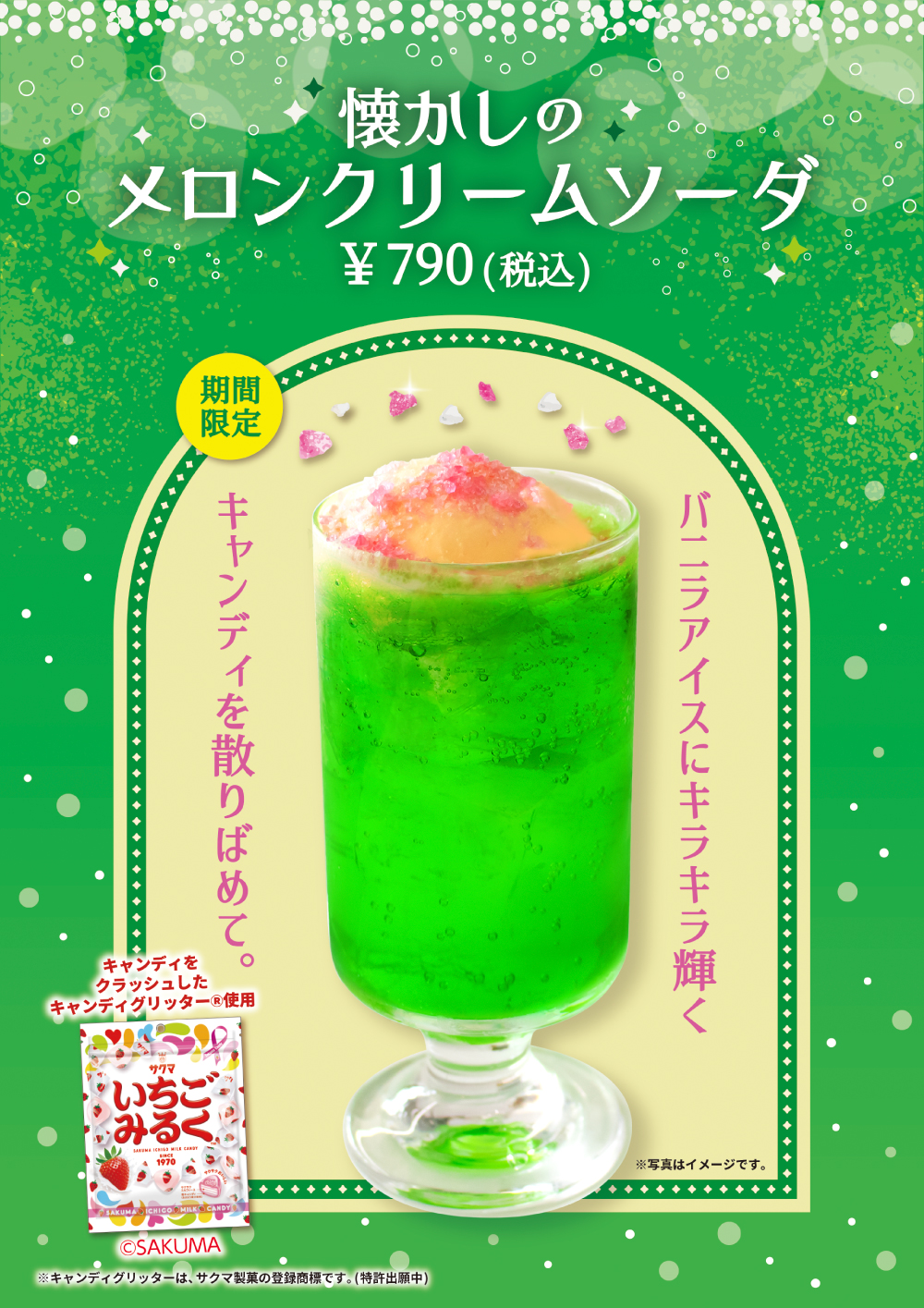7月15日(土)開始 期間限定『懐かしのメロンクリームソーダ』 2023年7月14日 季節限定おすすめドリンク 2023年7月15日 開始 懐かしのメロンクリームソーダ バニラアイスにキラキラ輝くキャンディを散りばめて。※サクマ製菓の『いちごみるく』キャンディをクラッシュしたキャンディグリッター®を使用したコラボメニューです。