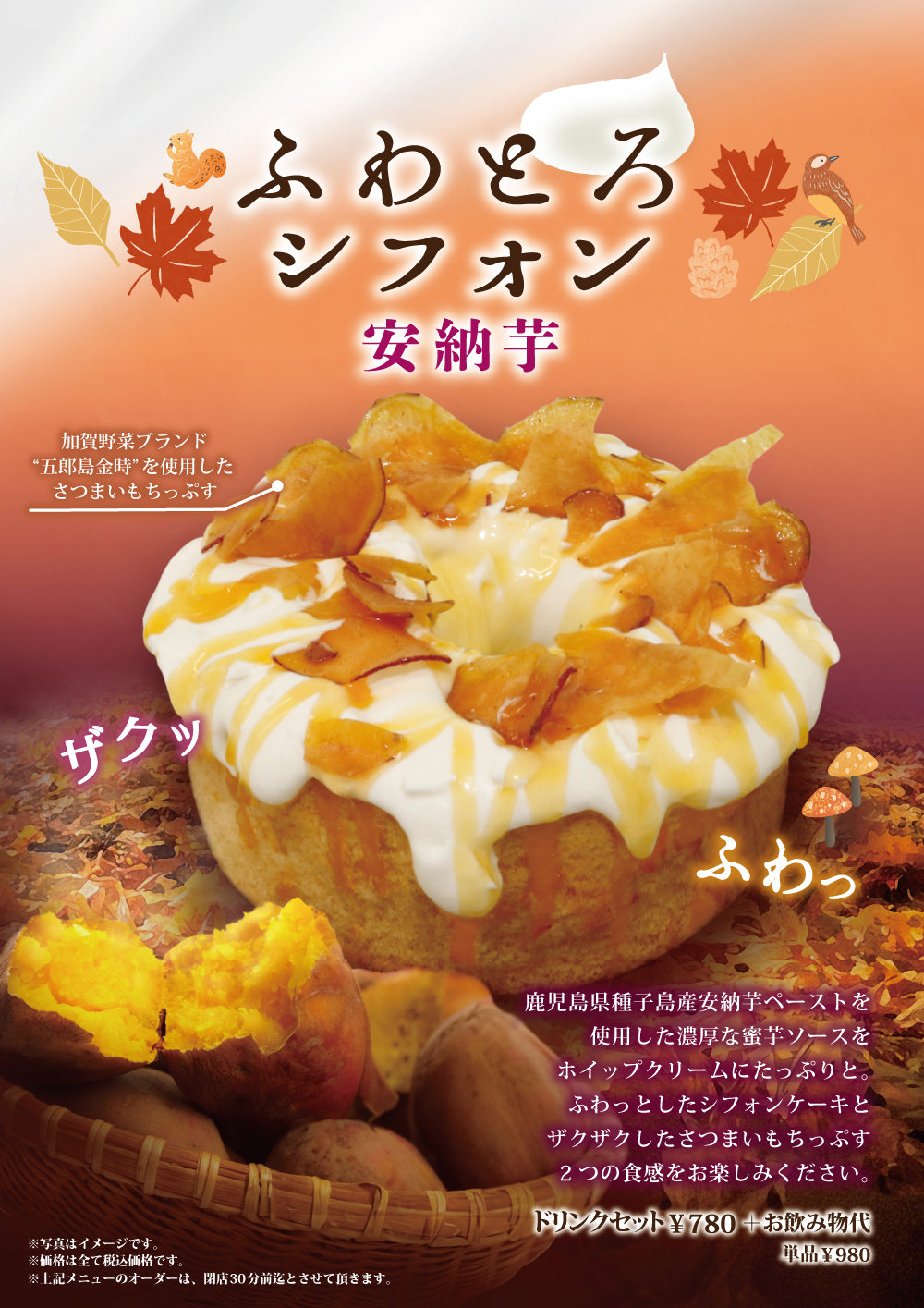 10月25日(金)開始 季節限定スイーツ『ふわとろシフォン 安納芋』 2024年10月25日 季節限定おすすめスイーツ 2024年10月25日(金) 開始 ふわとろシフォン 安納芋 セット ¥780+ドリンク代 / 単品 ¥980 鹿児島県種子島産安納芋ペーストを使用した濃厚な密芋ソースをホイップクリームにたっぷりと。ふわっとしたシフォンケーキとザクザクしたさつまいもちっぷす、2つの食感をお楽しみください。 Cafe Miyama インフォメーション 季節のおすすめ メニュー 当店のこだわり カロリー・アレルギー物質情報 店舗検索 採用情報