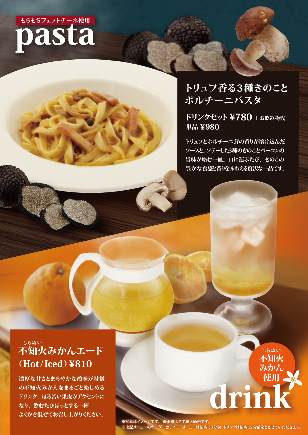 11月20日(木)開始 期間限定パスタ『トリュフ香る3種のきのことポルチーニパスタ』 2025年11月21日 期間限定パスタ 2025年11月20日(木) 開始 トリュフ香る3種のきのことポルチーニパスタ ドリンクセット¥780+お飲み物代 単品/¥980 トリュフとポルチーニ茸の香りが溶け込んだソースと、ソテーした3種のきのことベーコンの旨味が絡む一皿。口に運ぶたび、きのこの豊かな食感と香りを味わえる贅沢な一品です。 >