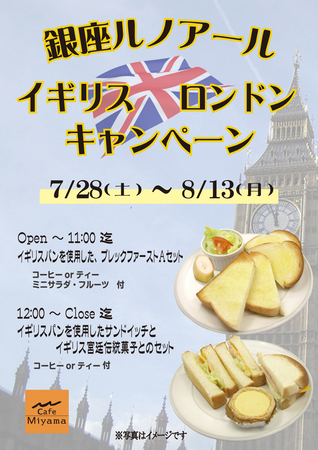7月28日(土)開始 イギリスロンドンキャンペーン 2012年7月25日 カフェ・ミヤマ各店舗おきまして、平成24年7月28日(土)から8月13日(月)までの間、下記の特別メニューを販売いたします。是非ご賞味ください。 店舗のご案内はこちら