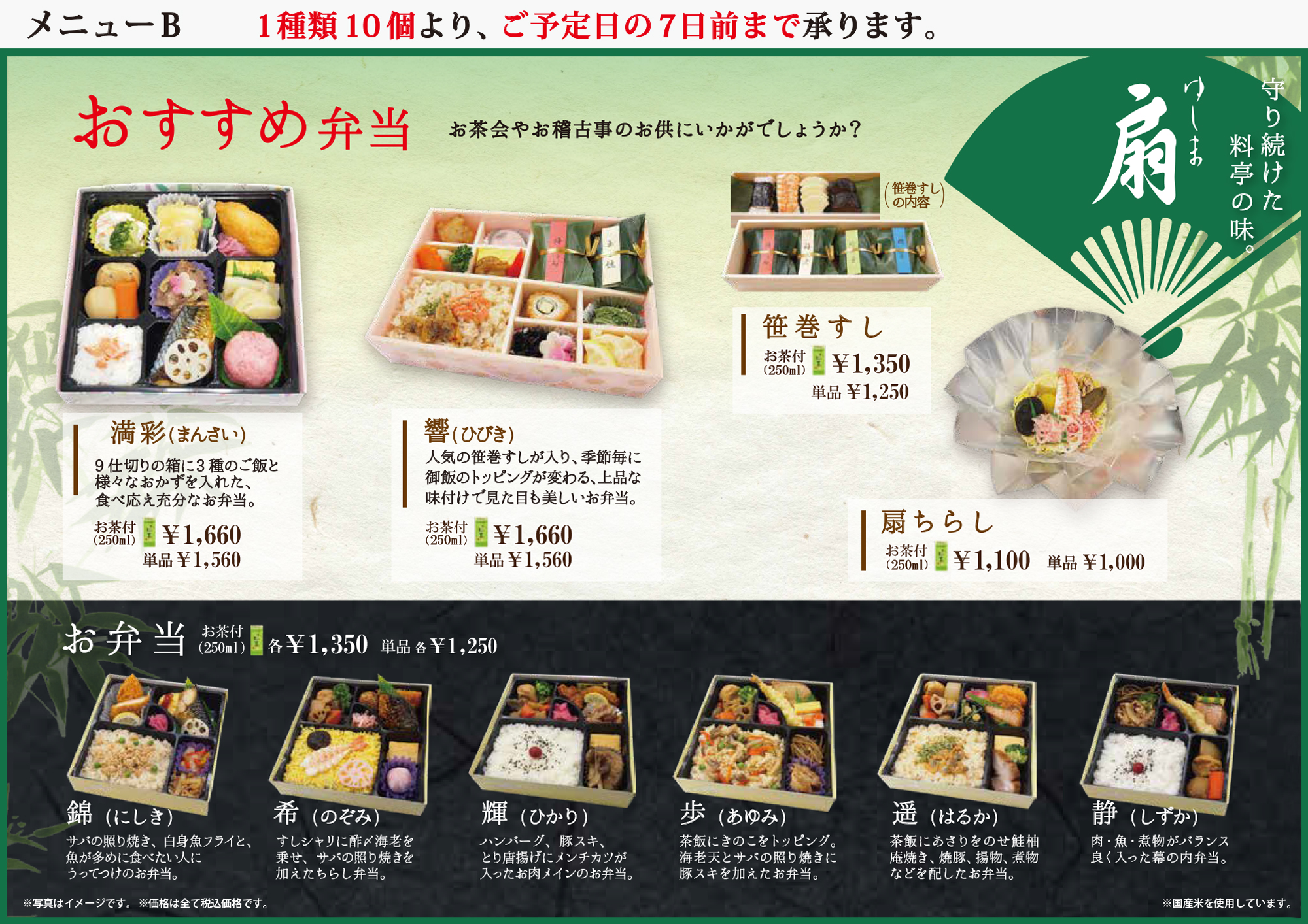 ※メニューBは、1種類10個(お茶付・単品選択可)より、ご利用日の7日前まで承ります。
