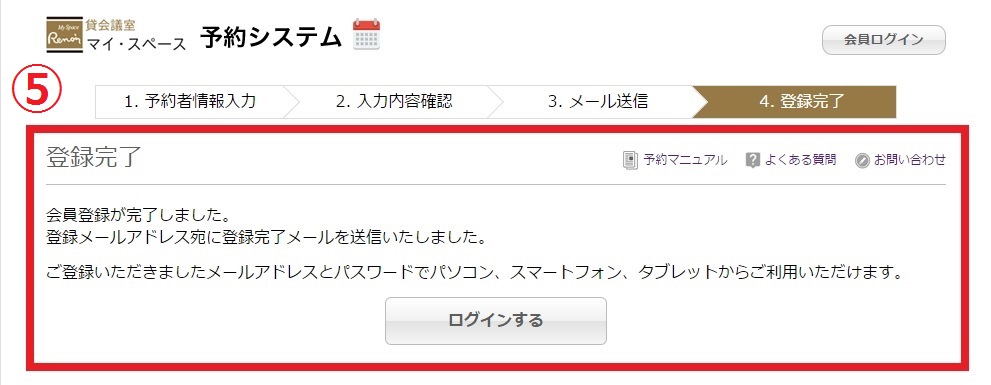 ⑤この画面が表示されましたら新規会員登録が終了です。【ログインする】ボタンを押してマイページへ移動してください。