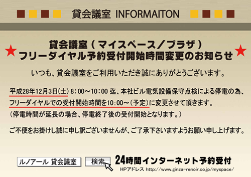12月3日(土)フリーダイヤル予約受付開始時間変更のお知らせ 2016年11月2日 平成28年12月3日(土) 8:00~10:00迄銀座ルノアール本社ビル停電の為、フリーダイヤル予約受付開始時間が下記のとおり変更になります。