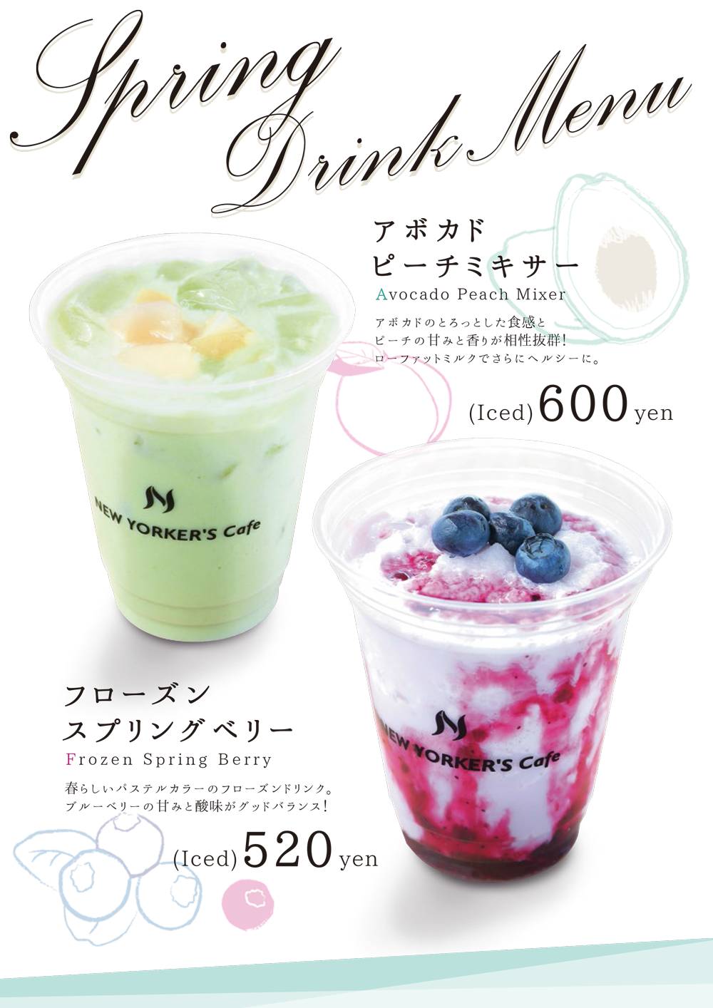 3月1日開始 期間限定おすすめメニュー 2017年2月28日 春のおすすめドリンクメニュー 2017年3月1日(水)開始 アボカドピーチミキサー アボカドのとろっとした食感とピーチの甘みと香りが相性抜群! ローファットミルクでさらにヘルシーに。 フローズンスプリングベリー 春らしいパステルカラーのフローズンドリンク。 ブルーベリーの甘みと酸味がグッドバランス! 春のおすすめフードメニュー 2017年3月1日(水)開始 たっぷりツナとキャベツときざみトマトの和だしパスタ おだしが香る和風パスタに、ツナとトマトが意外なベストマッチ! キャベツの甘みと食感も活きています。 ふわふわたまごと彩野菜の春カレー ドライカレーにたまごを合わせてマイルドに。 枝豆の食感とトマトの酸味がアクセントになっています。 鮮やかな見た目も楽しいライスメニュー。