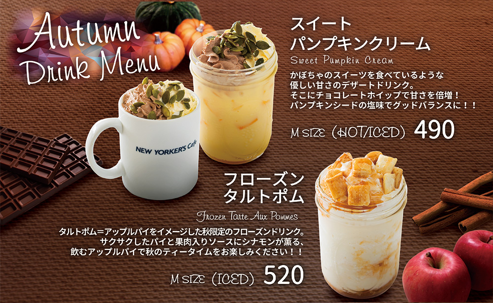 9月1日開始 期間限定おすすめメニュー 2017年9月01日 期間限定秋のおすすめメニュー 2017年9月1日(金)開始 スイートパンプキンクリーム かぼちゃのスイーツを食べているような優しい甘さのデザートドリンク。 そこにチョコレートホイップで甘さを倍増! パンプキンシードの塩味でグッドバランスに!! フローズンタルトポム タルトポム=アップルパイをイメージした秋限定のフローズンドリンク。 サクサクしたパイと果肉入りソースにシナモンが薫る、飲むアップルパイで秋のティータイムをお楽しみください!!