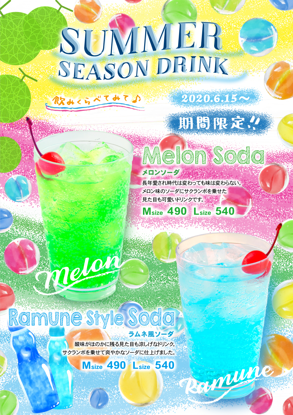 6月15日開始 期間限定おすすめメニュー 2020年6月15日 メロンソーダ 昭和の時代から喫茶店の定番!長年愛され時代は変わっても味は変わらない。メロン味のソーダにサクランボを乗せて見た目も可愛いドリンクです。 ラムネ風ソーダ 酸味がほのかに残る見た目も涼しげなドリンク。サクランボを乗せて、爽やかなソーダに仕上げました。
