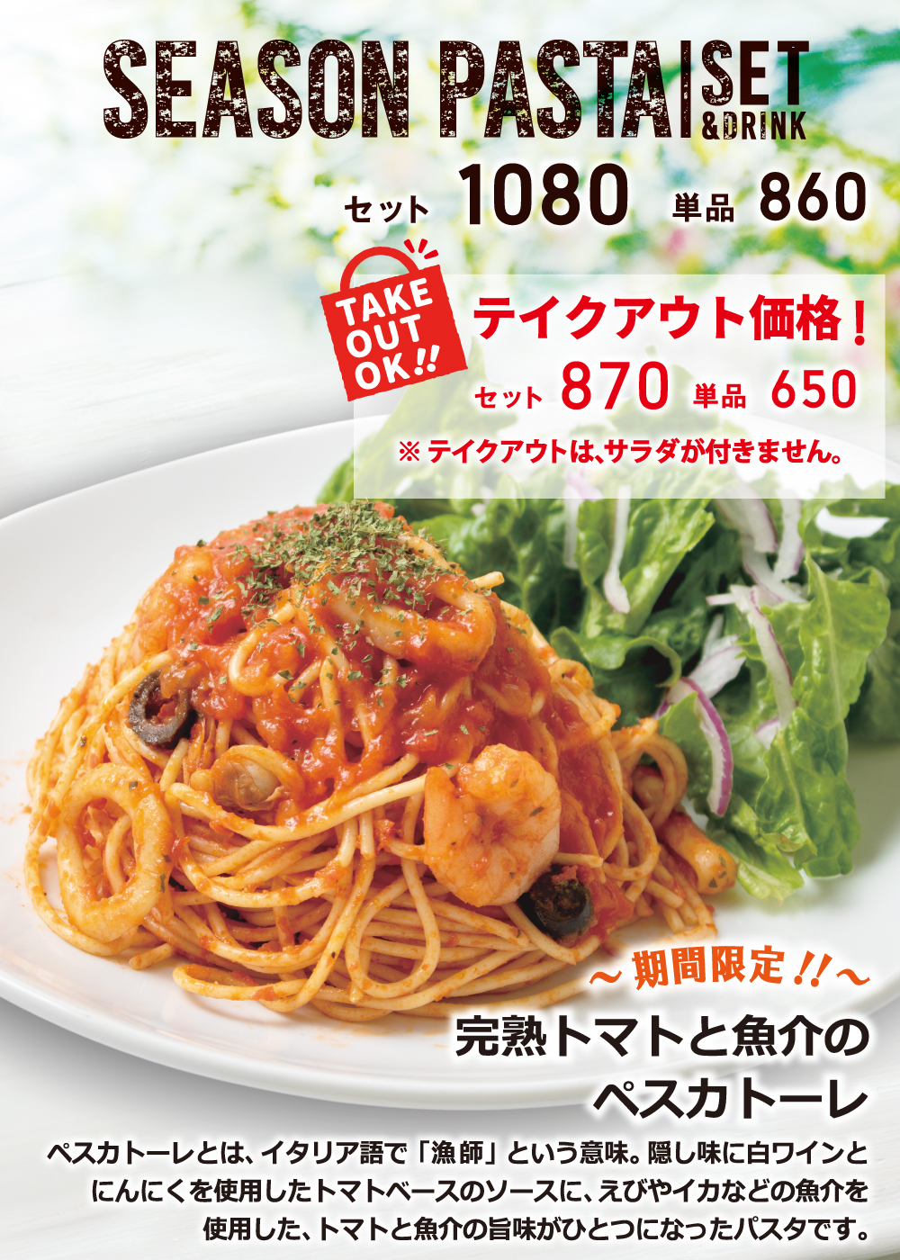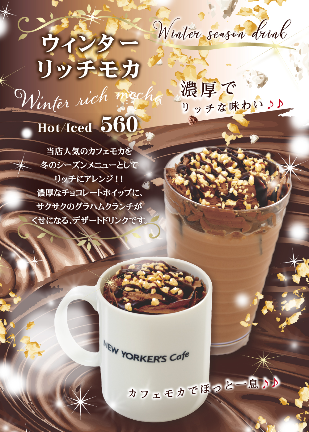 12月15日(火)開始 期間限定おすすめメニュー 2020年12月15日 期間限定 おすすめドリンク 2020年12月15日 開始 ウィンターリッチモカ(Hot/Iced) 当店人気のカフェモカを冬のシーズンメニューとしてリッチにアレンジ!!濃厚なチョコレートホイップにサクサクのグラハムクランチがくせになる、デザートドリンクです。 期間限定 おすすめパスタ 2020年12月15日 開始 完熟トマトと魚介のペスカトーレ ペスカトーレとは、イタリア語で「漁師」という意味。隠し味に白ワインとにんにくを使用したトマトベースのソースに、えびやイカなどの魚介を使用した、トマトと魚介の旨味がひとつになったパスタです。 NEW YORKER'S Cafe インフォメーション 季節のおすすめ メニュー 当店のこだわり カロリー・アレルギー物質情報 店舗検索 採用情報