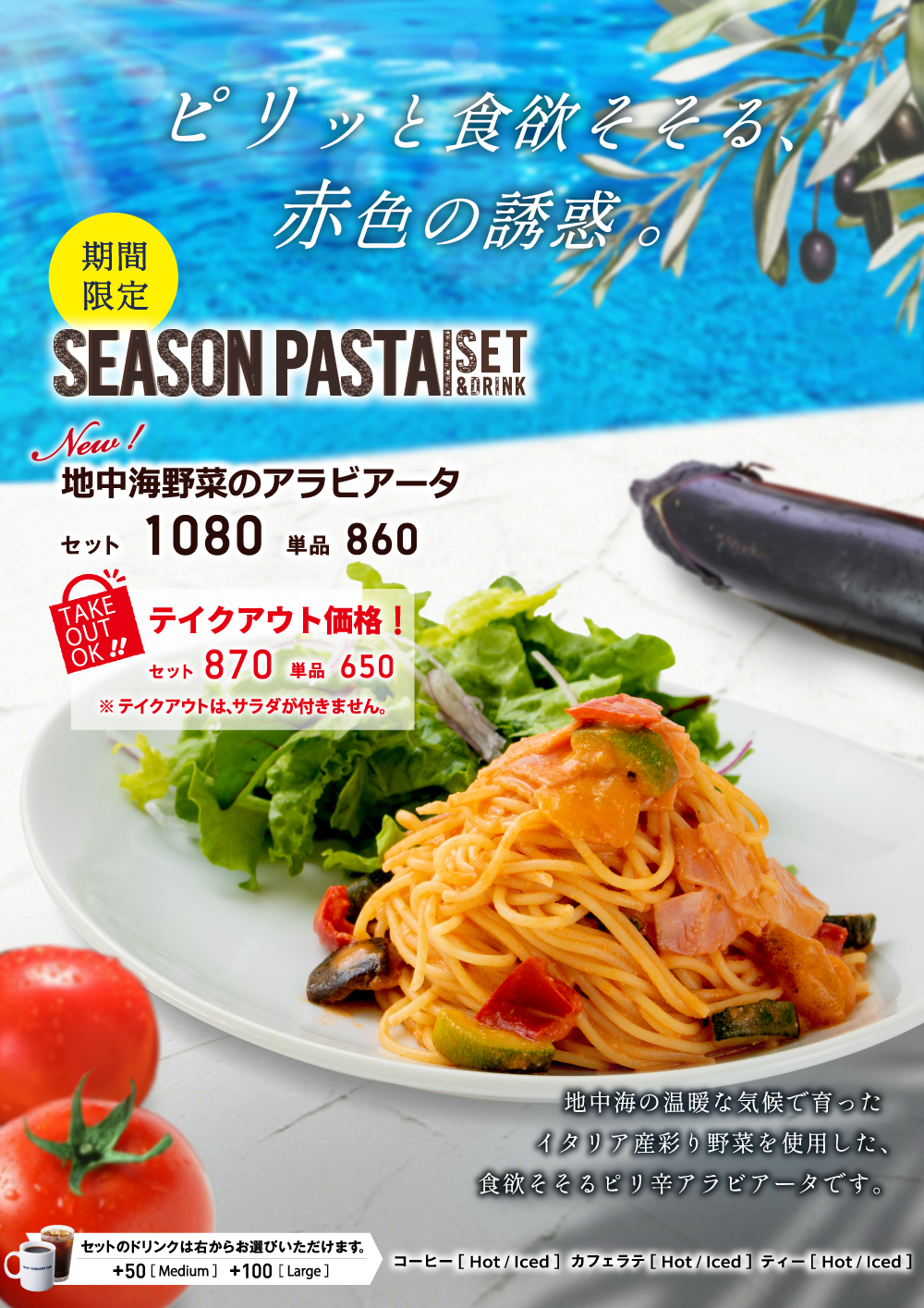 6月15日(火)開始 期間限定『地中海野菜のアラビアータ』 2021年6月15日 期間限定 おすすめパスタ 2021年6月15日 開始 地中海野菜のアラビアータ 地中海の温暖な気候で育ったイタリア産彩り野菜を使用した、食欲そそるピリ辛アラビアータです。