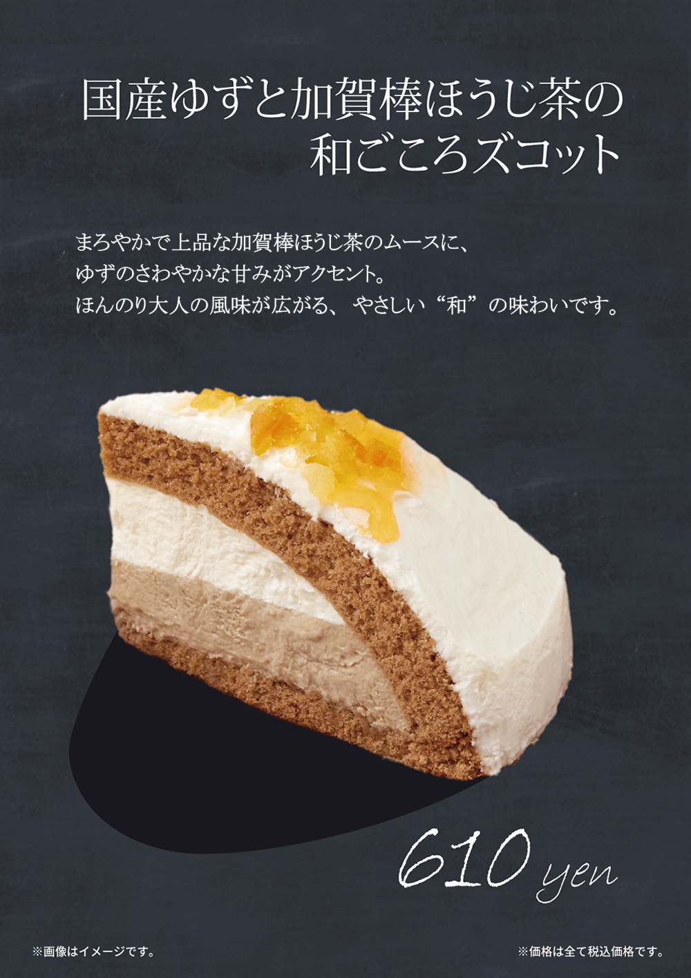 10月1日(水)開始 季節限定ケーキ『国産ゆずと加賀棒ほうじ茶の和ごころズコット』 2025年9月30日 季節限定ケーキ 2025年10月1日(水) 開始 国産ゆずと加賀棒ほうじ茶の和ごころズコット ¥610 まろやかで上品な加賀棒ほうじ茶のムースに、ゆずのさわやかな甘みがアクセント。ほんのり大人の風味が広がる、やさしい"和"の味わいです。