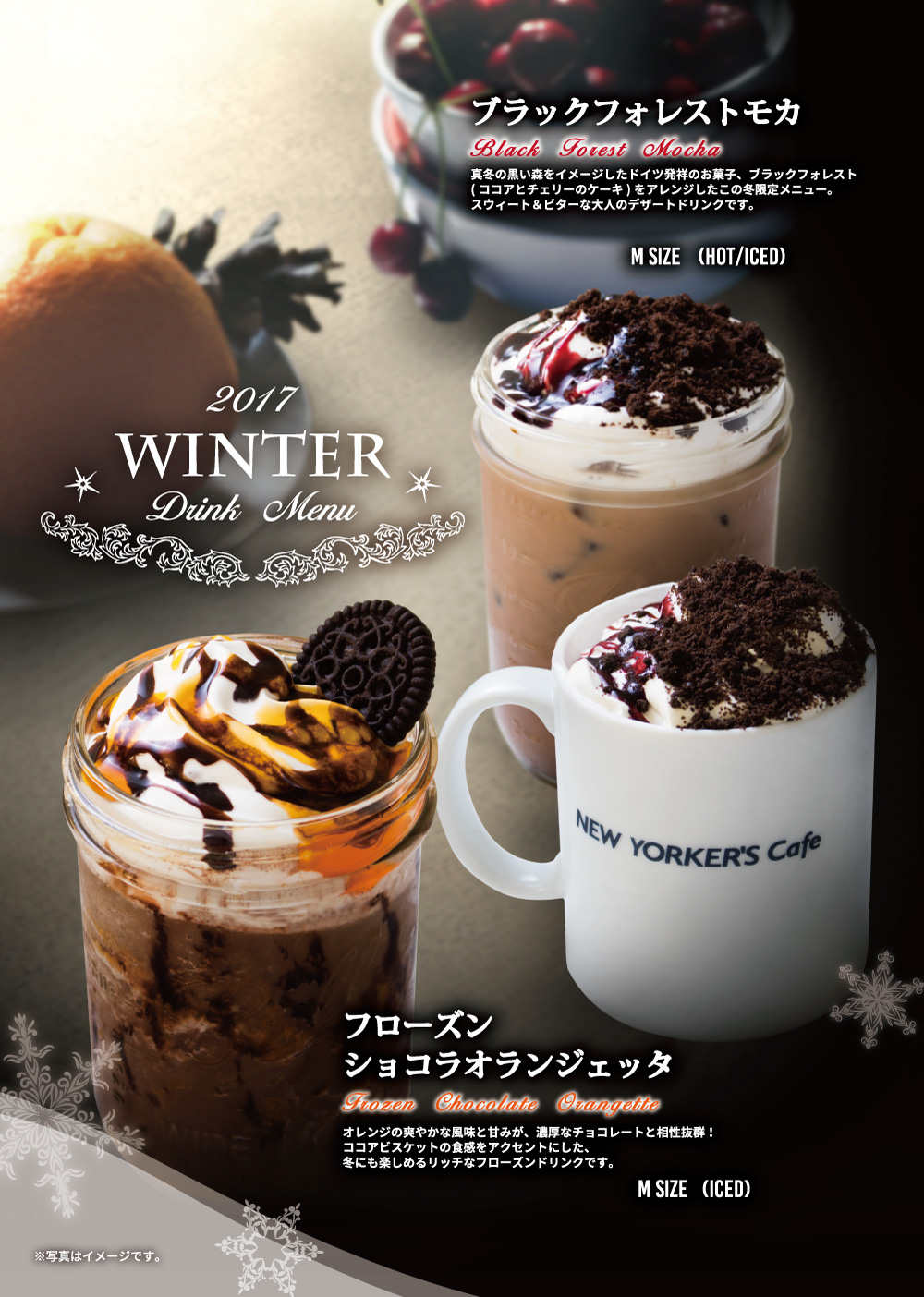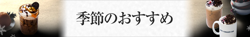 12月1日開始 期間限定おすすめメニュー 2017年12月1日 期間限定冬のおすすめメニュー 2017年12月1日(金)開始 ブラックフォレストモカ 真冬の黒い森をイメージしたドイツ発祥のお菓子、ブラックフォレスト(ココアとチェリーのケーキ)をアレンジしたこの冬限定のメニュー。 スウィート&ビターの大人のデザートドリンクです。 フローズンショコラオランジェッタ オレンジのさわやかな風味と甘みが、濃厚なチョコレートと相性抜群! ココアビスケットの食感をアクセントにした、冬にも楽しめる立地なフローズンドリンクです。