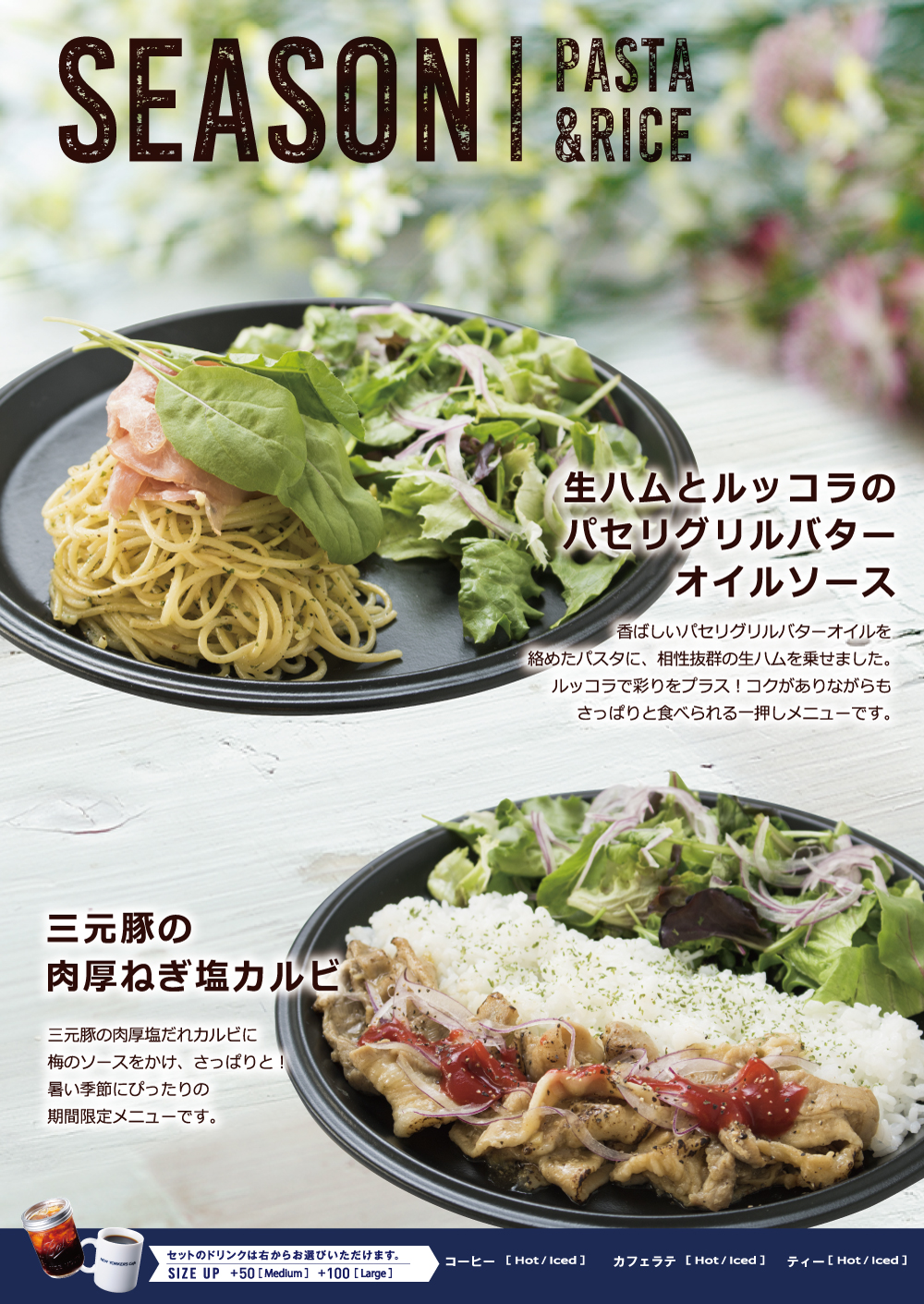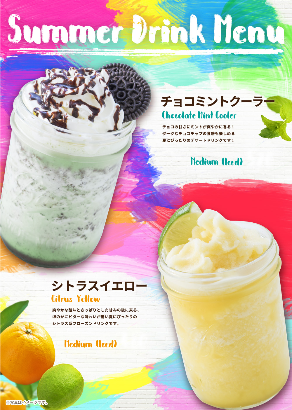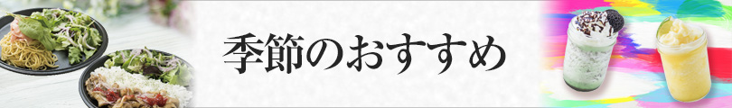 6月1日開始 期間限定おすすめメニュー 2018年6月01日 期間限定夏のおすすめメニュー 2018年6月1日(金)開始 チョコミントクーラー チョコの甘さにミントが爽やかに香る! ダークなチョコチップの食感も楽しめる 夏にぴったりのデザートドリンクです! シトラスイエロー 爽やかな酸味とさっぱりとした甘みの後に来る、 ほのかにビターな味わいが暑い夏にぴったりの シトラス系フローズンドリンクです。 生ハムとルッコラのパセリフリルバターオイルソース 香ばしいパセリグリルバターオイルを 絡めたパスタに、相性抜群の生ハムを乗せました。 ルッコラで彩りをプラス!コクがありながらも さっぱりと食べられる一押しメニューです。 三元豚の肉厚ねぎ塩カルビ 三元豚の肉厚塩だれカルビに 梅のソースをかけ、さっぱりと! 暑い季節にぴったりの 期間限定メニューです。