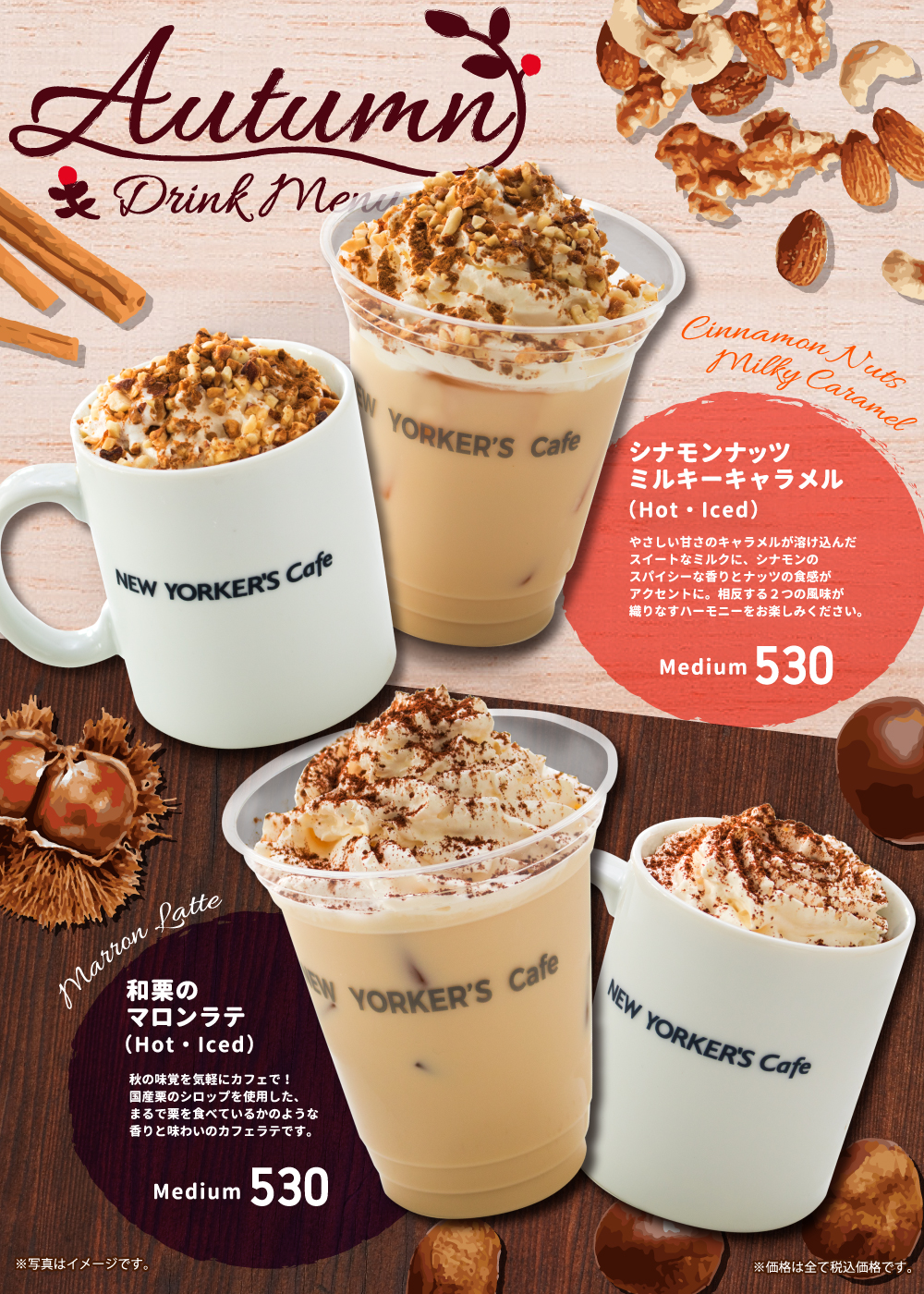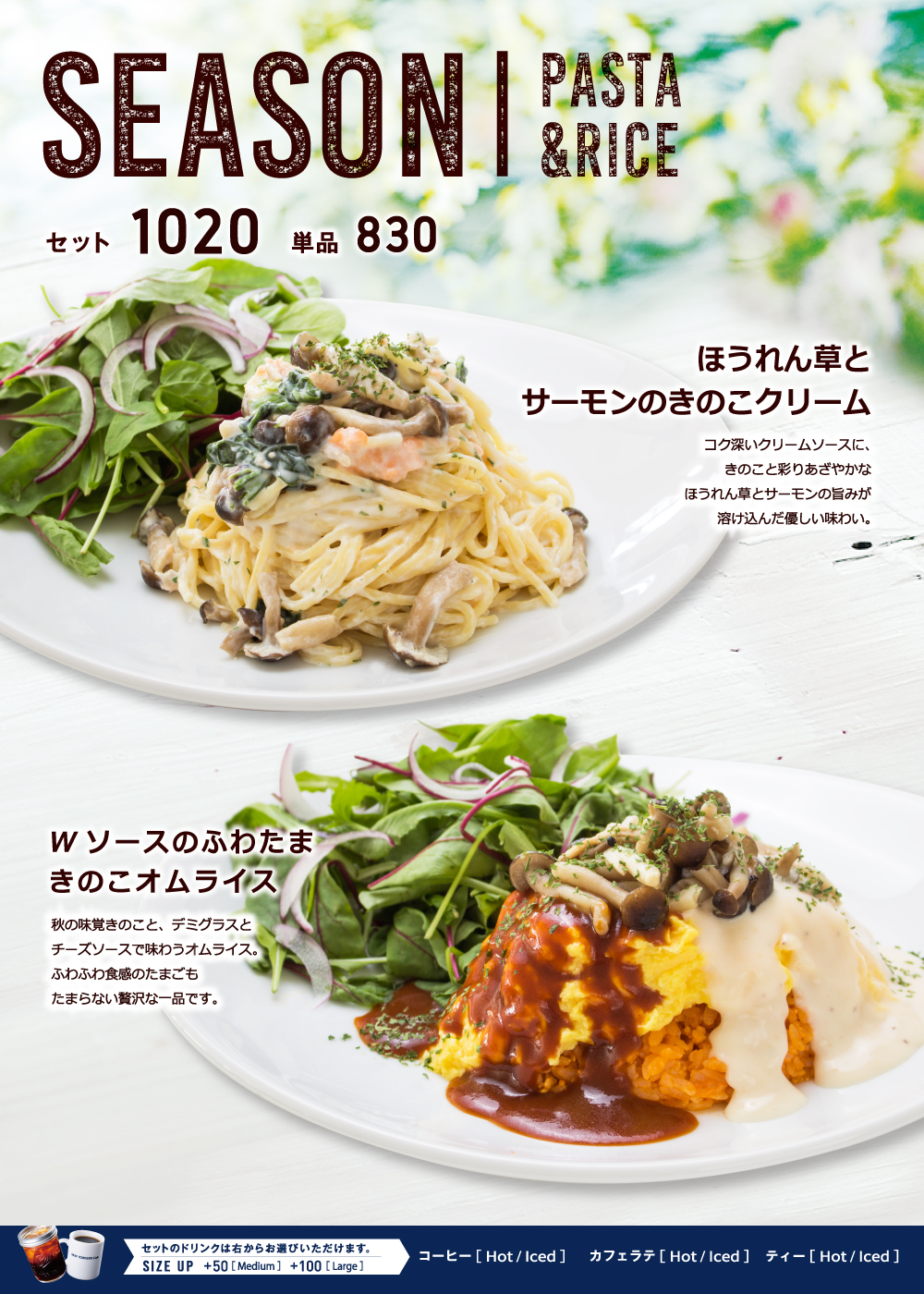 9月1日開始 期間限定おすすめメニュー 2019年9月01日 期間限定 秋のドリンクメニュー 2019年9月1日(日)開始 シナモンナッツミルキーキャラメル (Hot・Iced) やさしい甘さのキャラメルが溶け込んだスイートなミルクに、シナモンのスパイシーな香りとナッツの食感がアクセントに。 相反する2つの風味が織りなすハーモニーをお楽しみください。 和栗のマロンラテ 秋の味覚を気軽にカフェで! 国産栗のシロップを使用した、まるで栗を食べているかのような香りと味わいのカフェラテです。 期間限定秋のフードメニュー 2019年9月1日(日)開始 ほうれん草とサーモンのきのこクリーム コク深いクリームソースに、きのこと彩りあざやかなほうれん草とサーモンの旨みが溶け込んだ優しい味わい。 Wソースのふわたまきのこオムライス 秋の味覚きのこと、デミグラスとチーズソースで味わうオムライス。 ふわふわ食感のたまごもたまらない贅沢な一品です。
