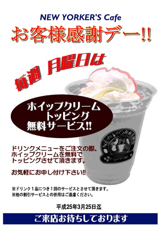 「お客様感謝デー」 月曜日ホイップ無料サービス 2012年6月04日 ニューヨーカーズ・カフェ各店舗におきまして、平成24年6月4日から平成25年3月25日までの間、毎週月曜日はお客様感謝デーとしてホイップクリームトッピングの無料サービスを実施いたします。 各店舗のご案内はこちら