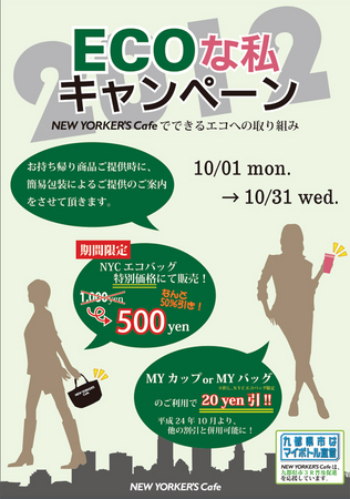 10月1日(月)開始 ECOな私キャンペーン 2012年9月29日 ニューヨーカーズ・カフェ10店舗におきまして、平成24年10月1日月曜日より下記のECOな私キャンペーンが実施となります。 店舗のご案内はこちら