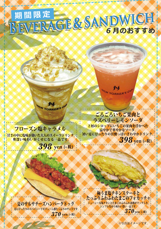 期間限定ドリンク&フードメニュー 2014年6月11日 ニューヨーカーズ・カフェ各店舗におきまして、平成26年6月1日(日)より下記のドリンク&フードメニューが導入となります。是非ご賞味ください。 ※フードメニューにつきましては水道橋西口駅前店は販売しておりません。何卒ご了承下さい。 店舗のご案内はこちら