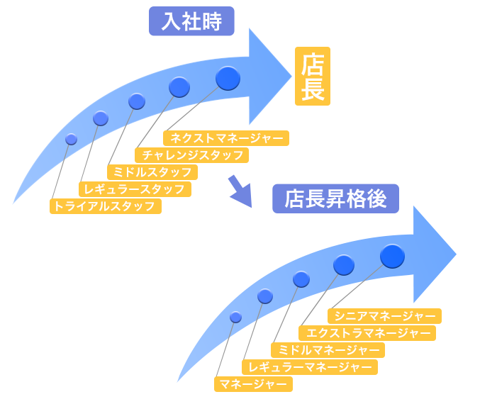 当社は創業以来、社内の活性化を図るため年功序列ではなく、職能資格制度によって役職や給与を決定してきました。社内の昇進試験制度は会社の発展に伴い、何回かの手直しを行い現在の制度になっています。性別、学歴、年齢、勤続年数に関係なく社内研修、昇進試験、業務評価等により昇進、昇給する制度です。適職性や能力は必要ですが、店舗を管理するためにはマネージメント能力が必要です。将来、店舗を管理運営するための運営システム、技術、人事管理、事務処理等を段階的に習得するための単位制の研修教育も制度化されています。努力してやっただけの成果が、すぐに自分のものとして得られる実力本位の人事制度です。