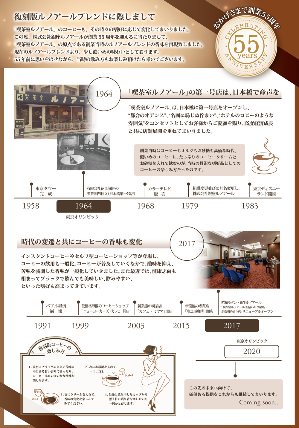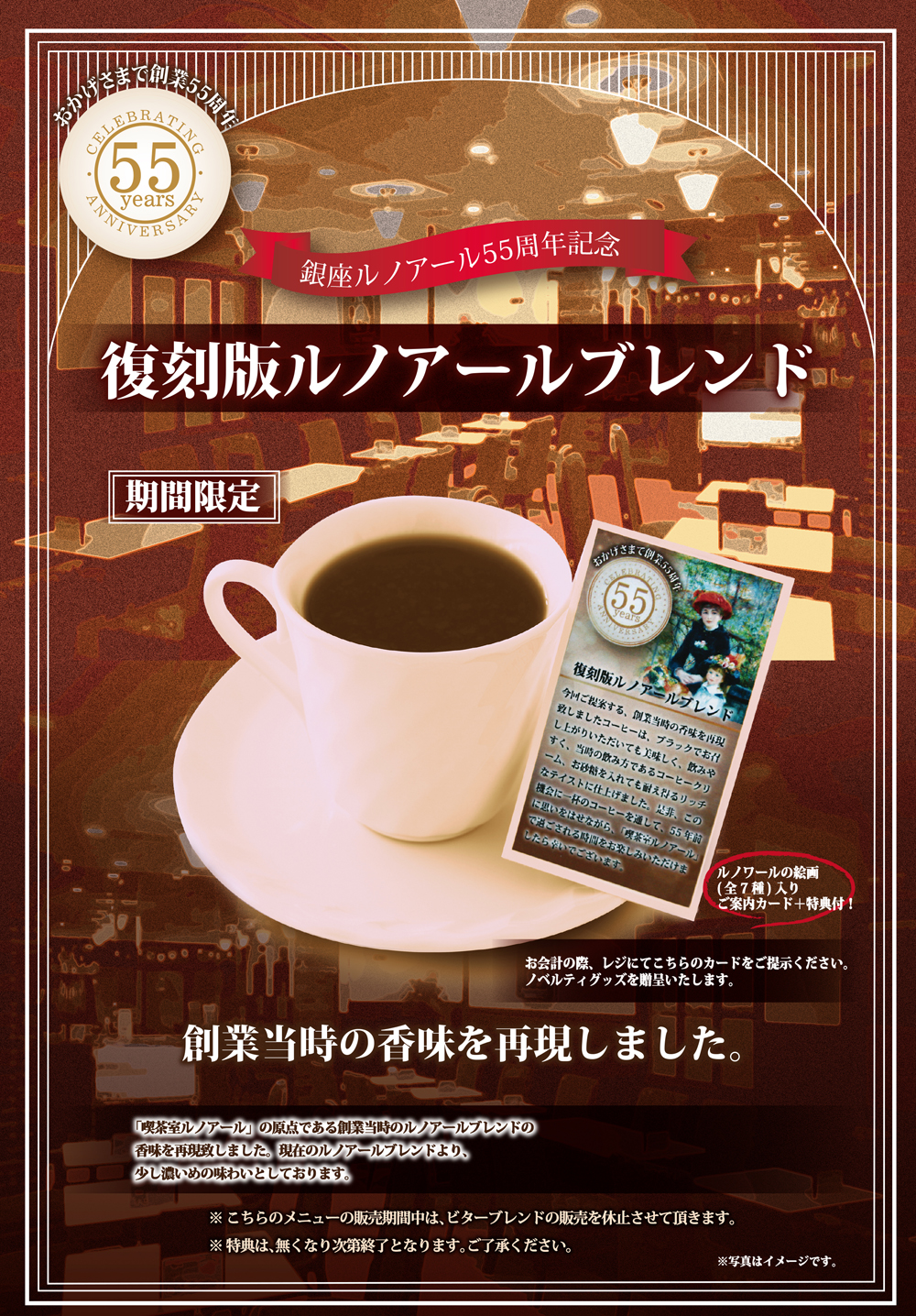 4月開始 期間限定『55周年復刻版ルノアールブレンド』 2017年4月05日 喫茶室ルノアール各店舗におきまして、下記の期間限定メニューが導入となりました。是非ご賞味ください。 対象外店舗:川越店、金町店、箱根湯本駅前店