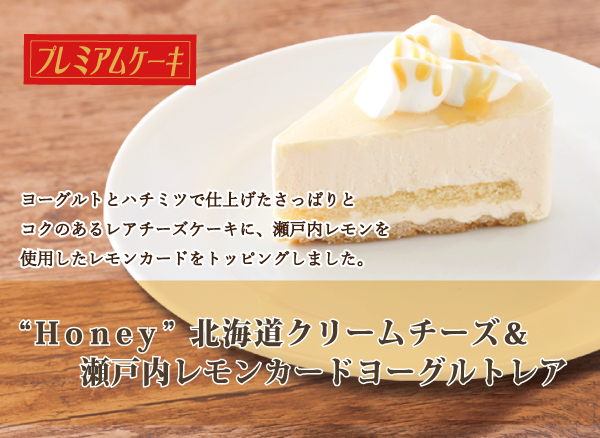 7月1日開始 期間限定ケーキメニュー 2017年7月13日 季節限定 ケーキメニュー 2017年7月1日(土)開始 "Honey" 北海道クリームチーズ&瀬戸内レモンカードヨーグルトレア ヨーグルトとハチミツで仕上げたさっぱりとコクのあるレアチーズケーキに、瀬戸内レモンを使用したレモンカードをトッピングしました。※対象外店舗:日本橋三越前店