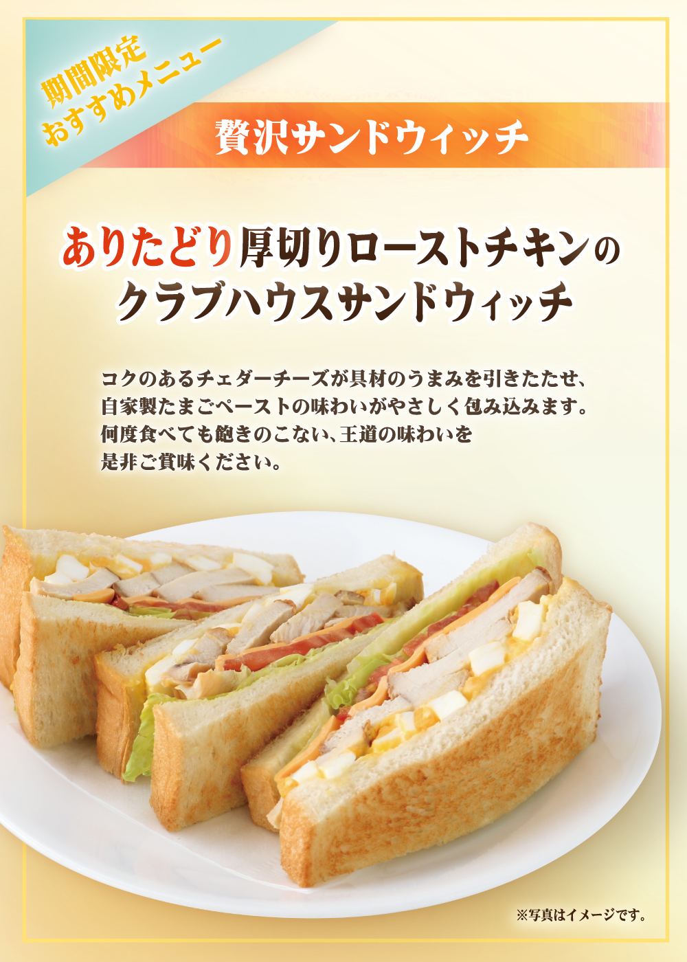 8月12日(水)開始 期間限定"プレミアムサンドウィッチメニュー" 2020年8月12日 期間限定おすすめサンドウィッチ 2020年8月12日 開始 "贅沢サンドウィッチ" ありたどり厚切りローストチキンのクラブハウスサンドウィッチ コクのあるチェダーチーズがグザイのうまみをひきたたせ、自家製たまごペーストの味わいがやさしく包み込みます。何度食べても飽きのこない、王道の味わいを是非ご賞味ください。 ※以下の店舗ではお取り扱いがございません。 川越店・金町店・箱根湯本駅前店