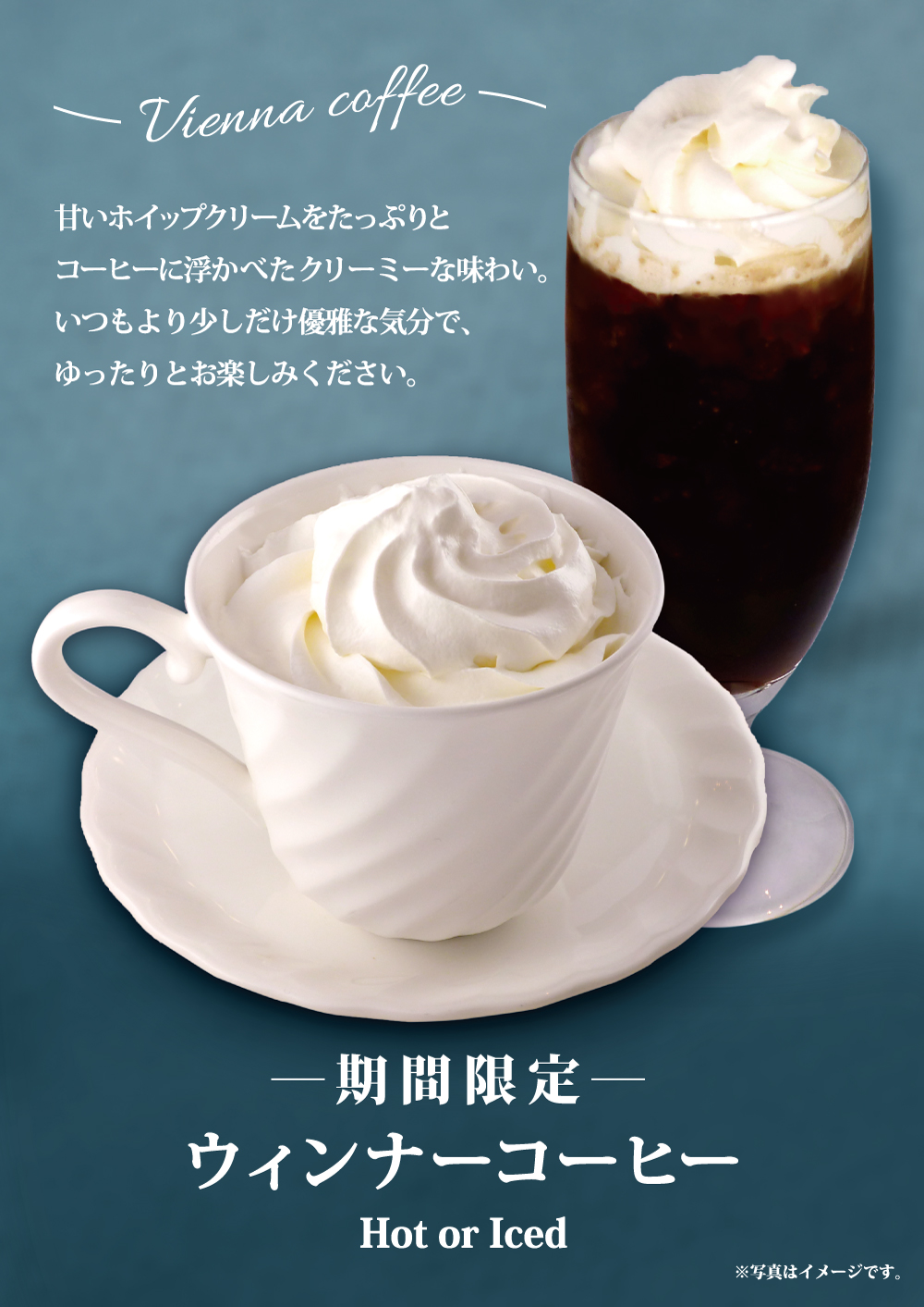 10月14日(水)開始 期間限定おすすめメニュー 2020年10月15日 ウィンナーコーヒー (Hot or Iced) 甘いホイップクリームをたっぷりとコーヒーに浮かべたクリーミーな味わい。いつもより少しだけ優雅な気分で、ゆったりとお楽しみください。 ※以下の店舗ではお取り扱いがございません。 川越店・金町店・箱根湯本駅前店
