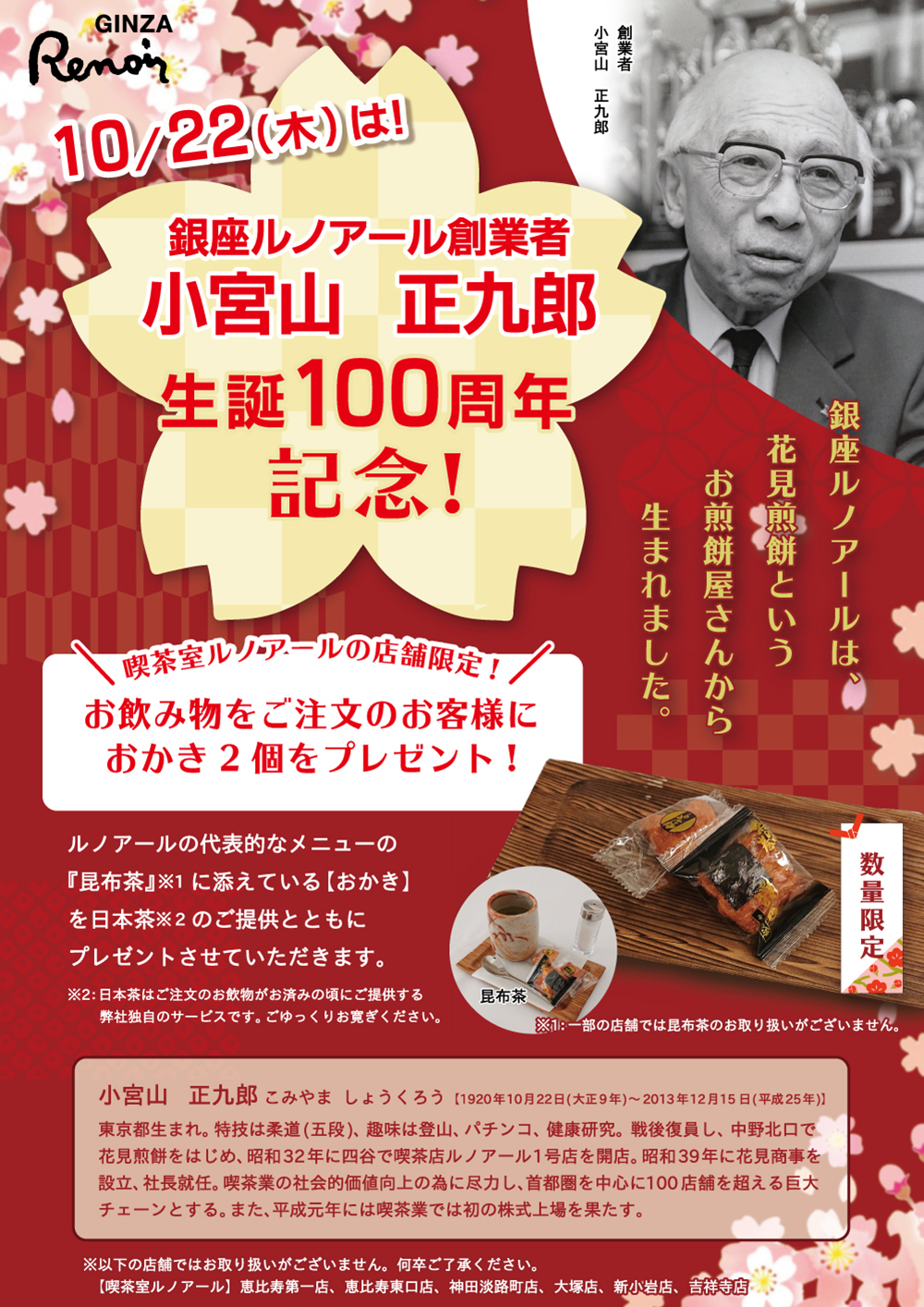 10月22日(木)は!銀座ルノアール創業者 小宮山 正九郎の生誕100周年記念!