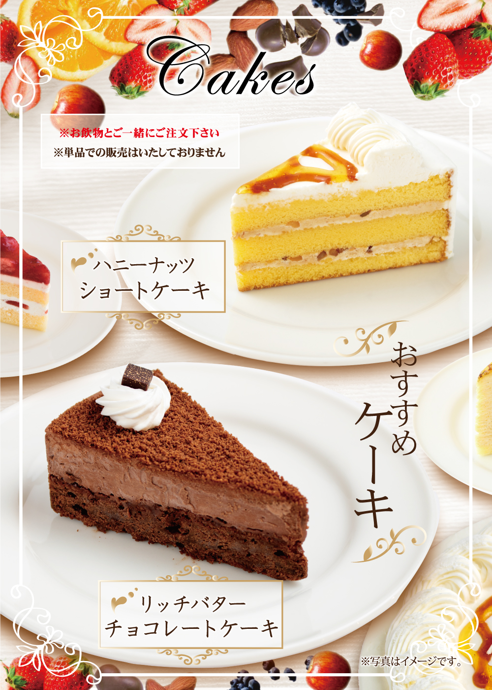 12月15日(火)開始 おすすめケーキメニュー 2020年12月15日 おすすめケーキ 2020年12月15日 開始 ハニーナッツショートケーキ 甘いはちみつ、香ばしいアーモンドが味わえる贅沢なショートケーキです。ほんのりはちみつが香るチーズクリームでコク深い味わいに。2色のハニーソースで華やかに仕上げました。 ※以下の店舗ではお取り扱いがございません。 川越店・金町店・箱根湯本駅前店 リッチバターチョコレートケーキ この季節に相応しい、華やかな香りが漂う、濃厚でリッチな味わいのチョコレートケーキです。上の層は、チョコレートガナッシュとクリームを合わせ、深みのある味わいに。下の層は、良質なチョコレートとバターを使用したバターケーキで、コクと深みを感じるテイストに仕上げました。 ※以下の店舗ではお取り扱いがございません。 川越店・金町店・箱根湯本駅前店