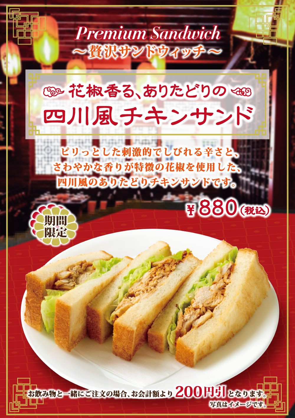 7月30日(金)開始 期間限定『花椒香る、ありたどりの四川風チキンサンド』 2021年7月30日 おすすめサンドウィッチ 2021年7月30日 開始 "贅沢サンドウィッチ"花椒香る、ありたどりの四川風チキンサンド 看板商品の「ありたどり」を使用した、贅沢サンドウィッチが登場!ピリっとした刺激的でしびれる辛さと、さわやかな香りが特徴の花椒を使用した、四川風のありたどりチキンサンドです。 ※以下の店舗ではお取り扱いがございません。 金町店・箱根湯本駅前店